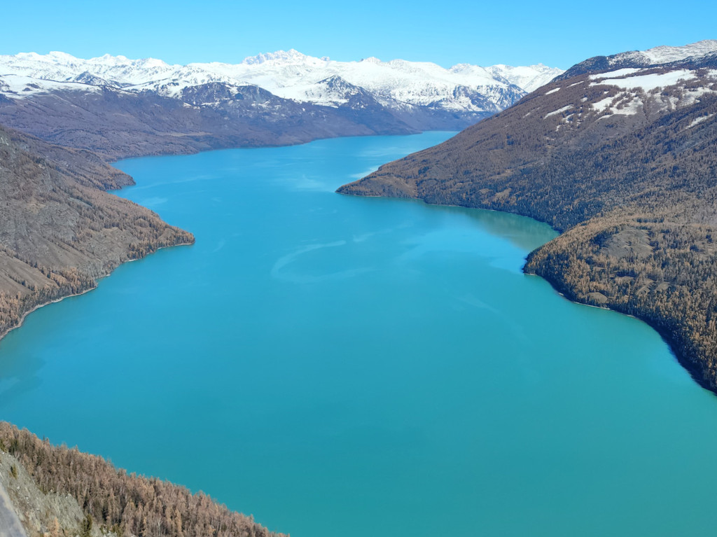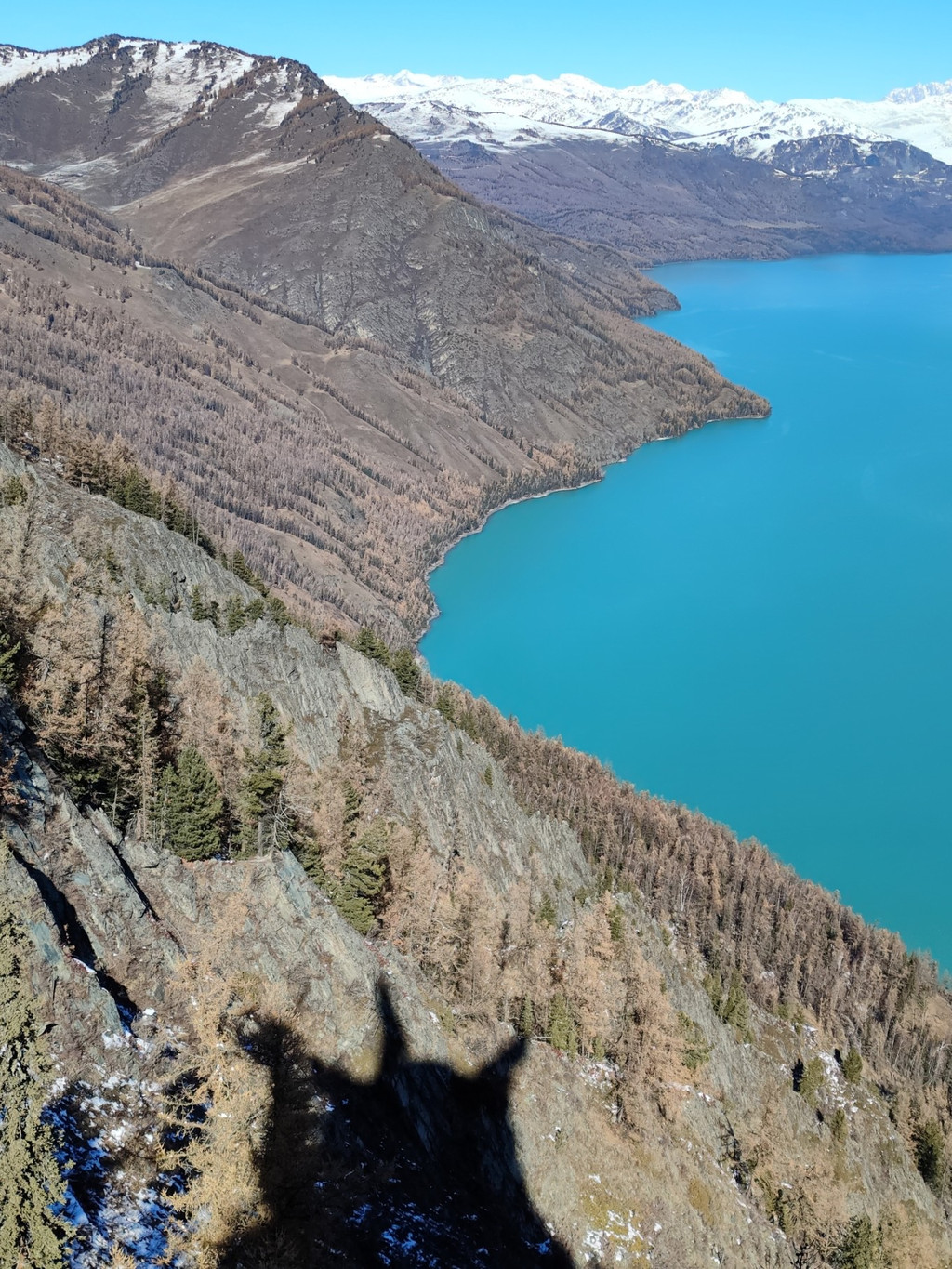 山坡不算抖,但走起来还是蛮吃力的,而且后半段草坡里面有蛮多带刺的小草,更得小心地走。跟老乡大哥一同感慨 新疆 真是大啊,半山腰回望这一片山峦,山顶是皑皑白雪,中间是 新疆 落叶松,再往下就是常绿松树,山脚下则是一大片草原,这会是秋末冬初,色彩会荒凉些,但 新疆 景观的广阔性尽显,让人心胸舒畅啊。沿着草坡起码走了一个小时,才到栈道,再慢慢往顶点的钓 鱼台 走去。
