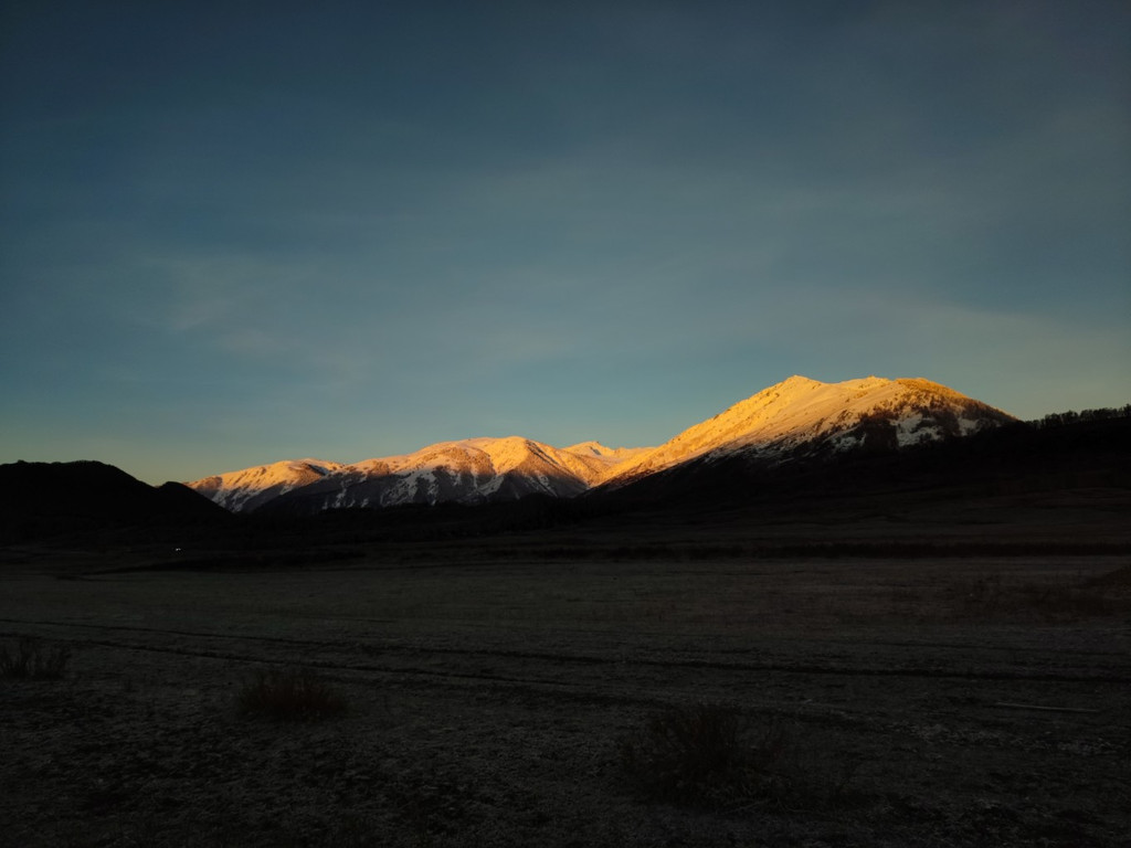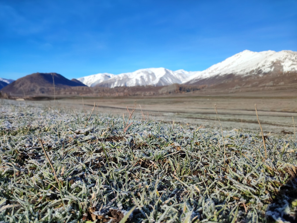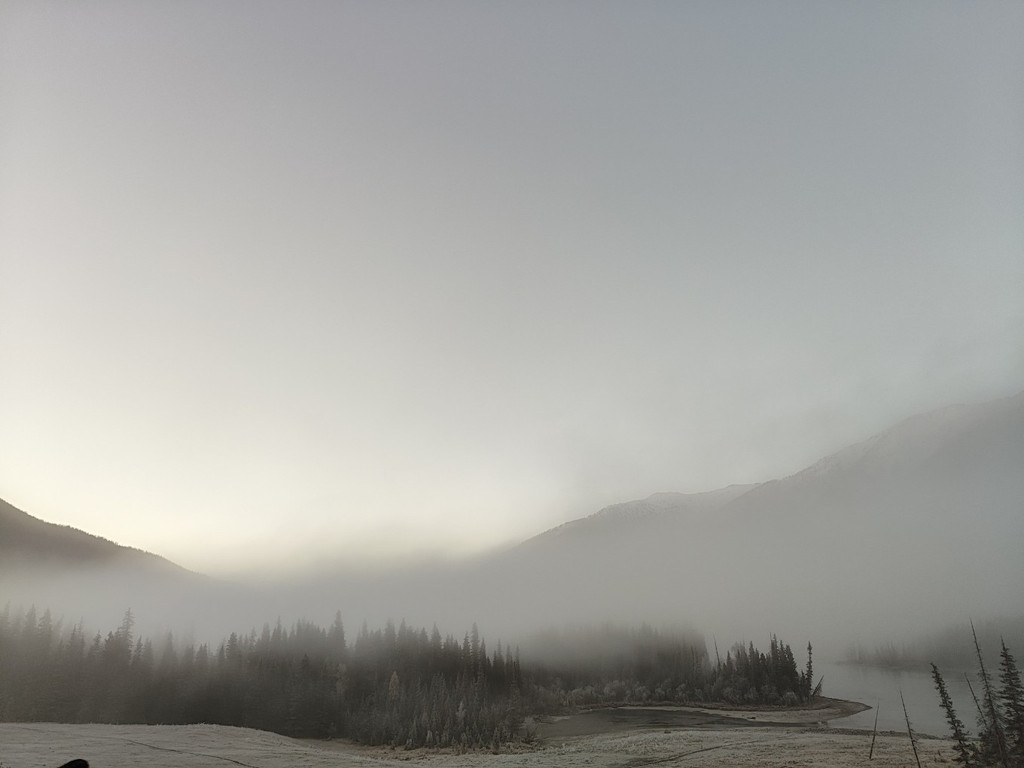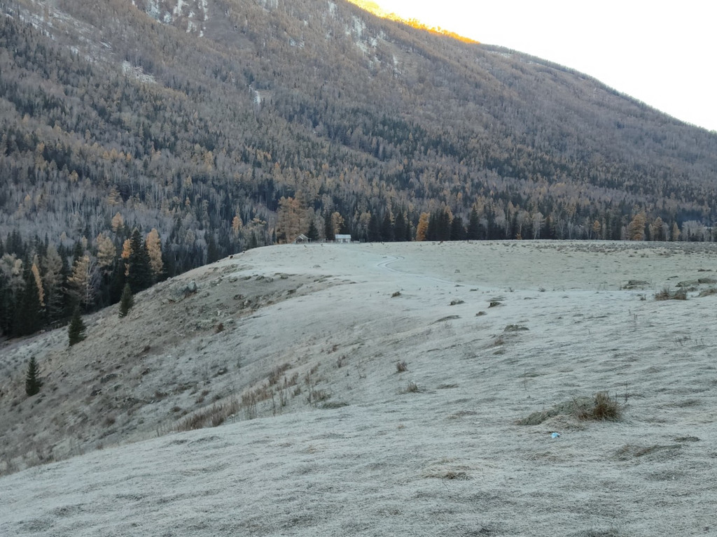 到卧龙湾,这里晨雾更加明显,同样也是 日照 雪山,金灿灿。这里也有一个小木屋和一片草地,初晨小草都被霜冻住,白色的一大片。有车辙印延伸到远处这个小木屋,走过去的路上,有一种归途的孤独感,孑然一身,遗世独立,苦行僧的禅意吗?哈哈哈。