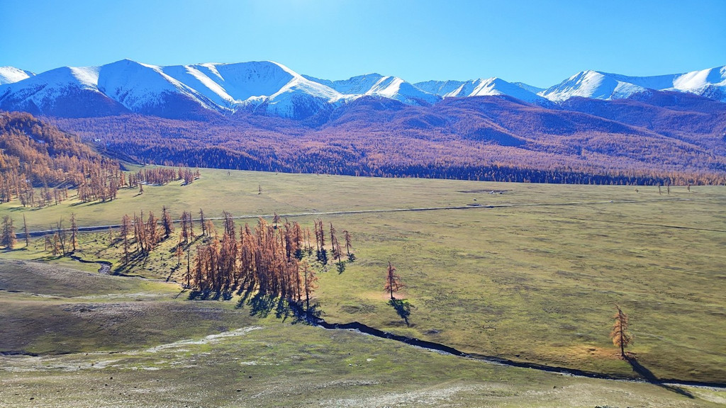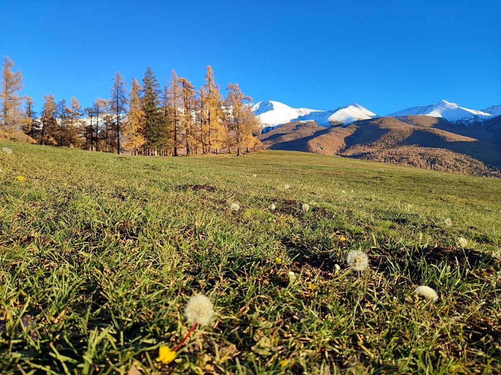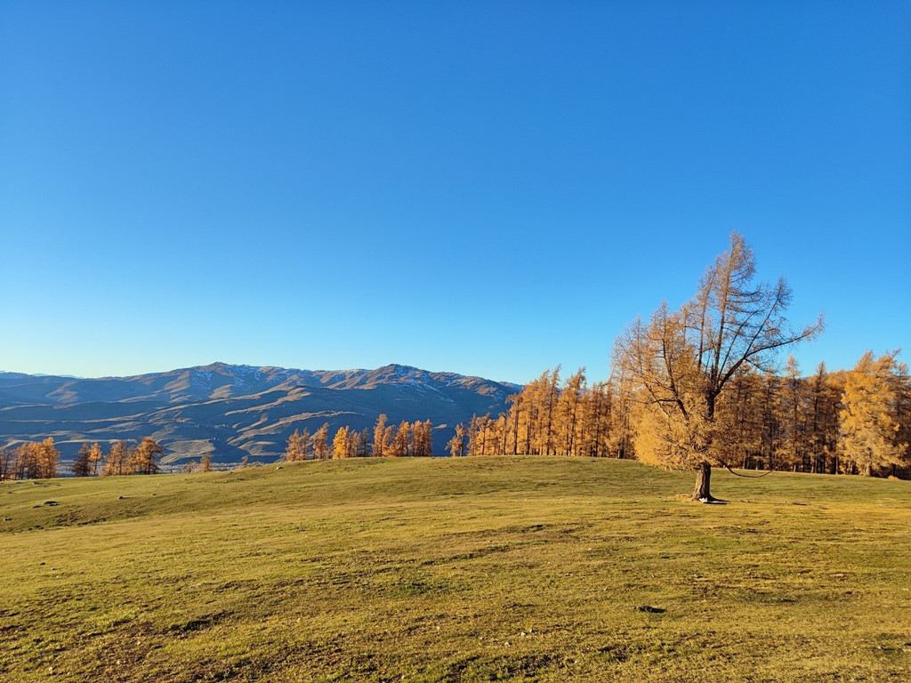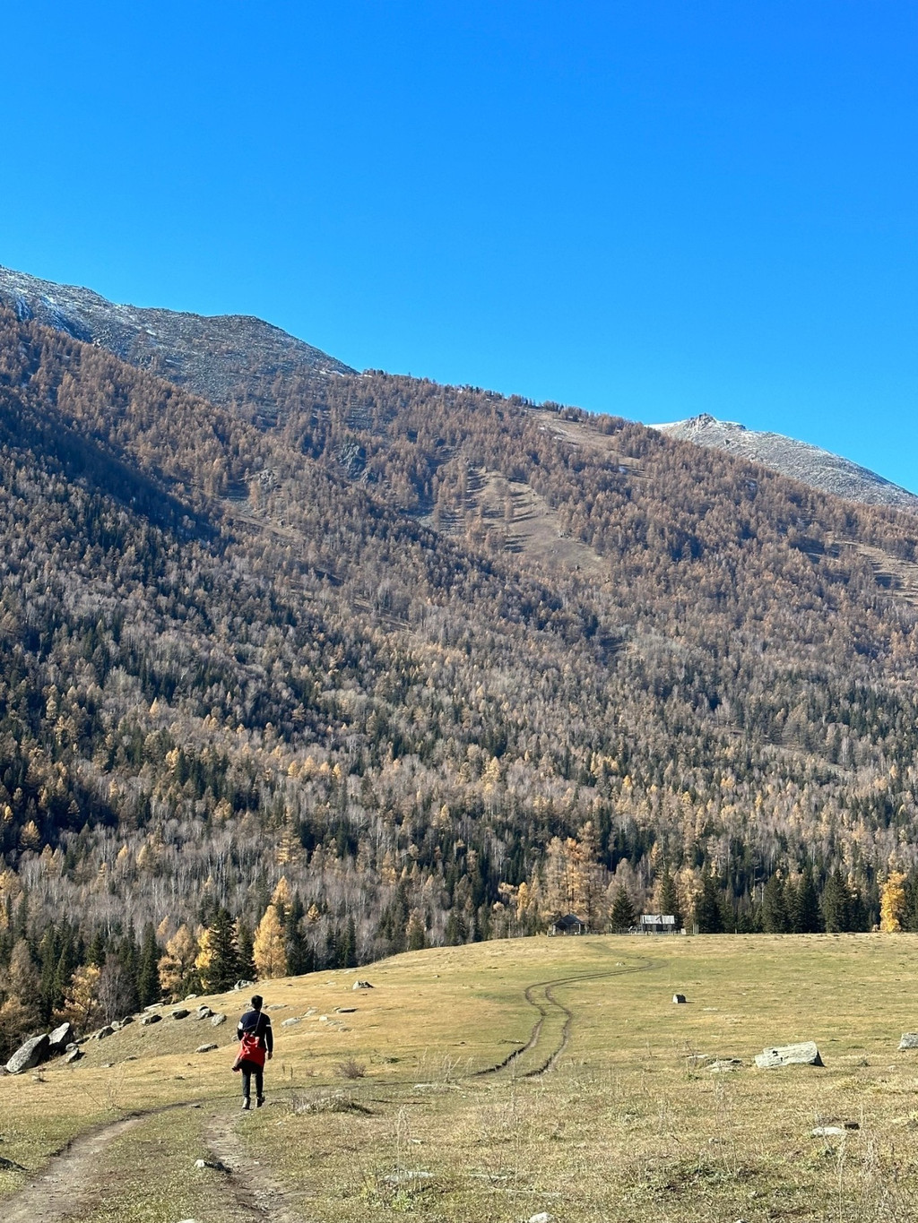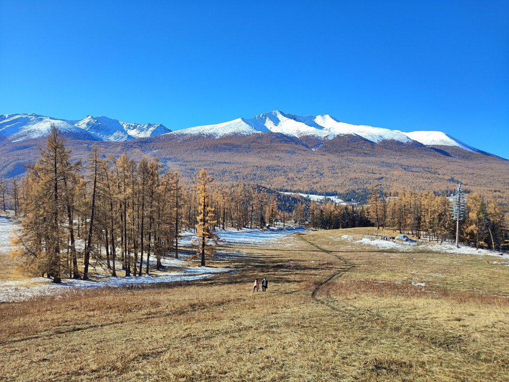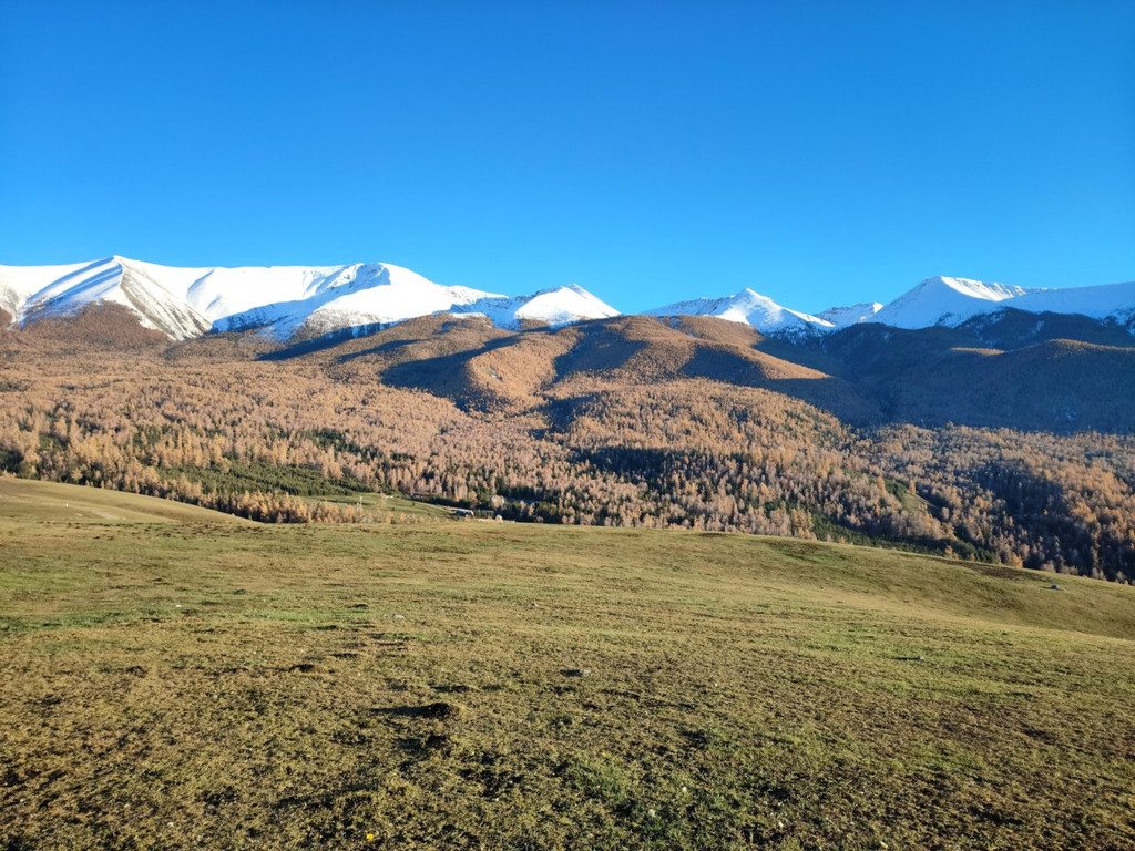 观景台旁边也是一片草原,看着不大,但真的可以走很久,草原北部有成片的金黄色的落叶松。这里真的是一山有四季景啊,春夏秋冬,草场花朵,绿色松柏,黄色落叶松,白色雪山。