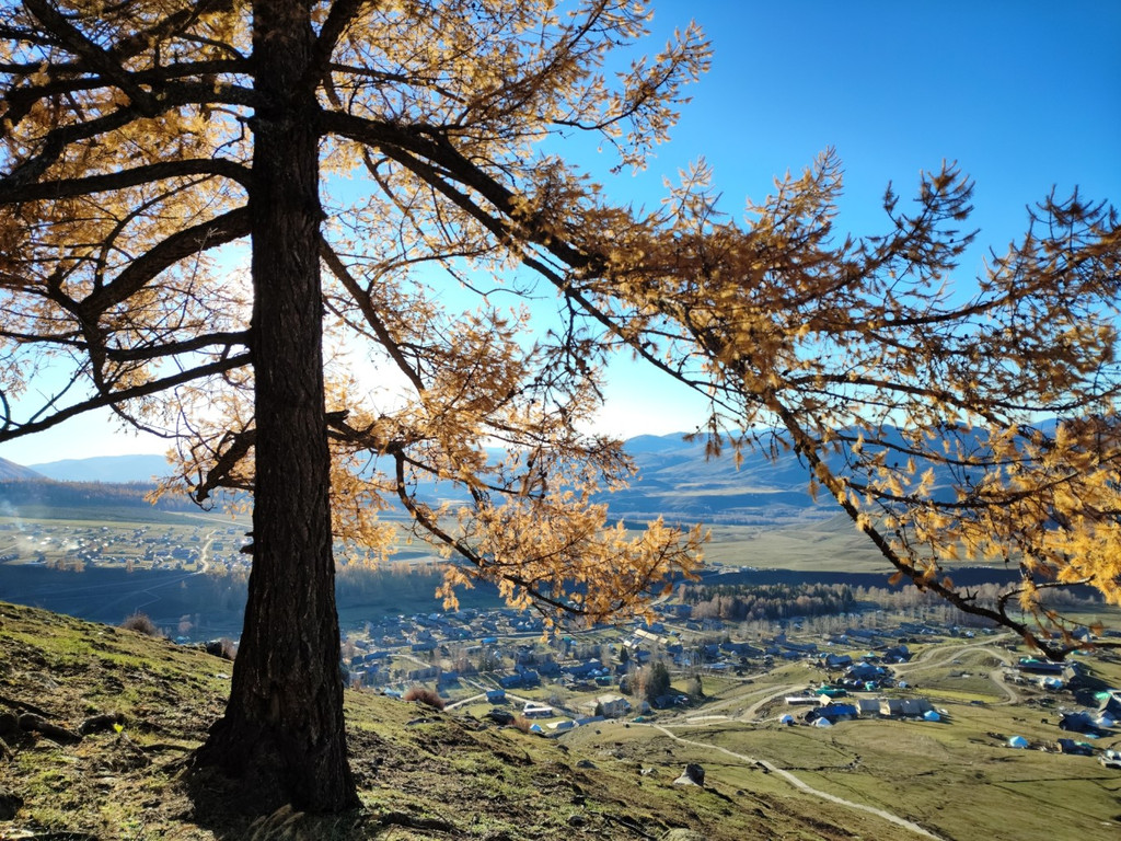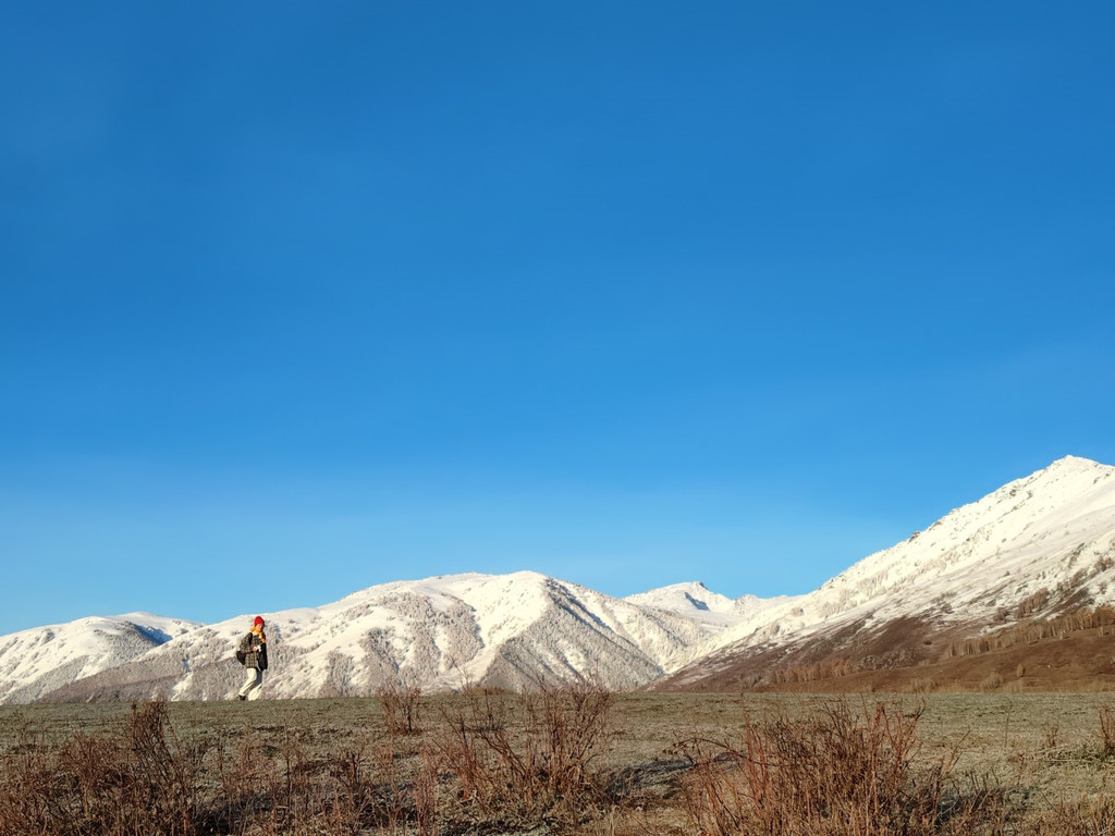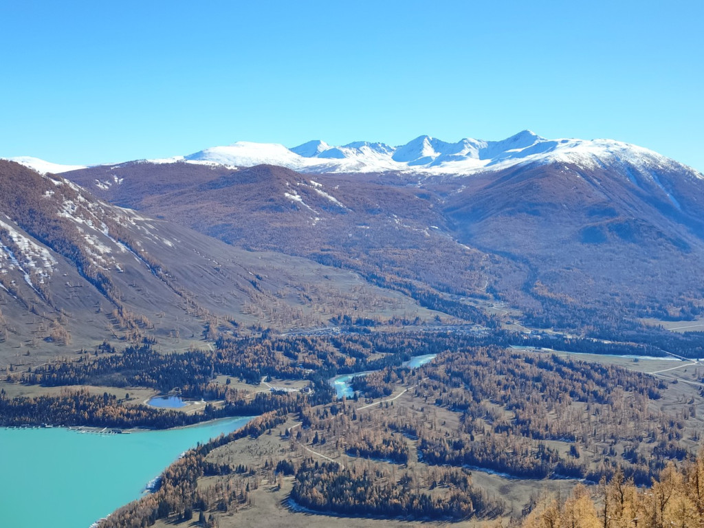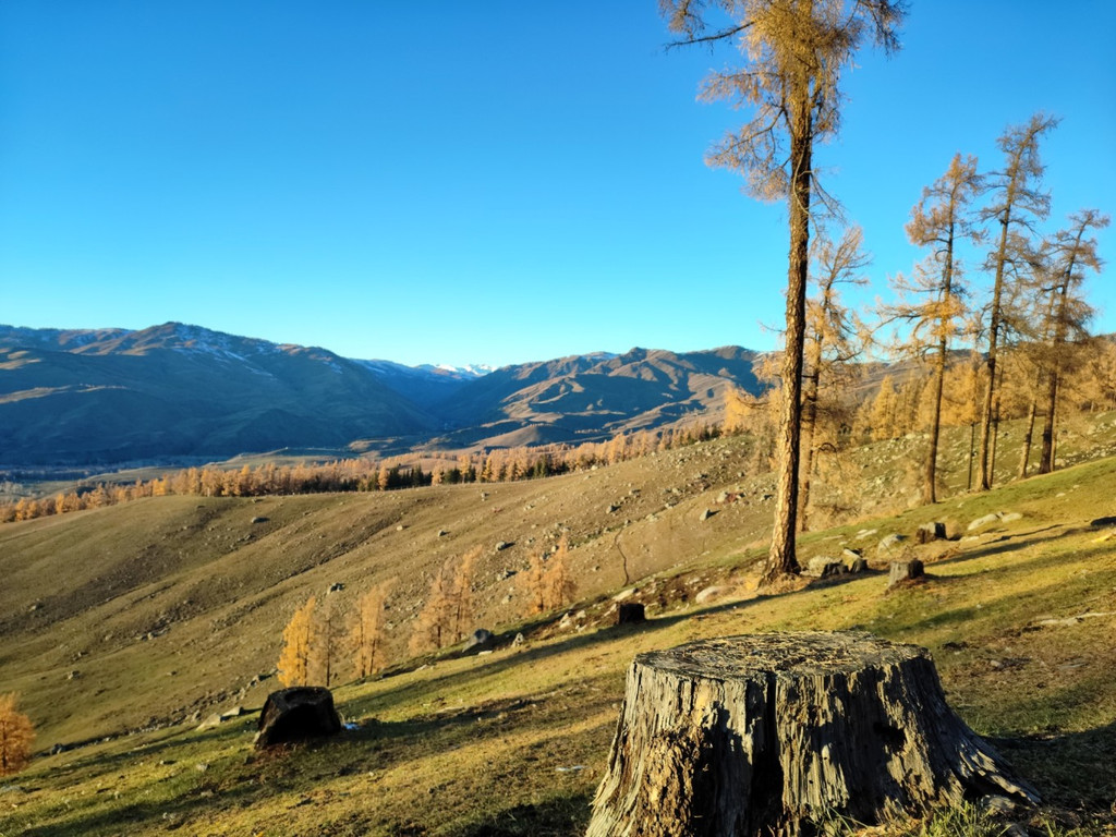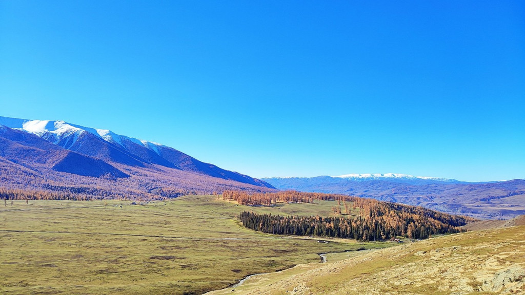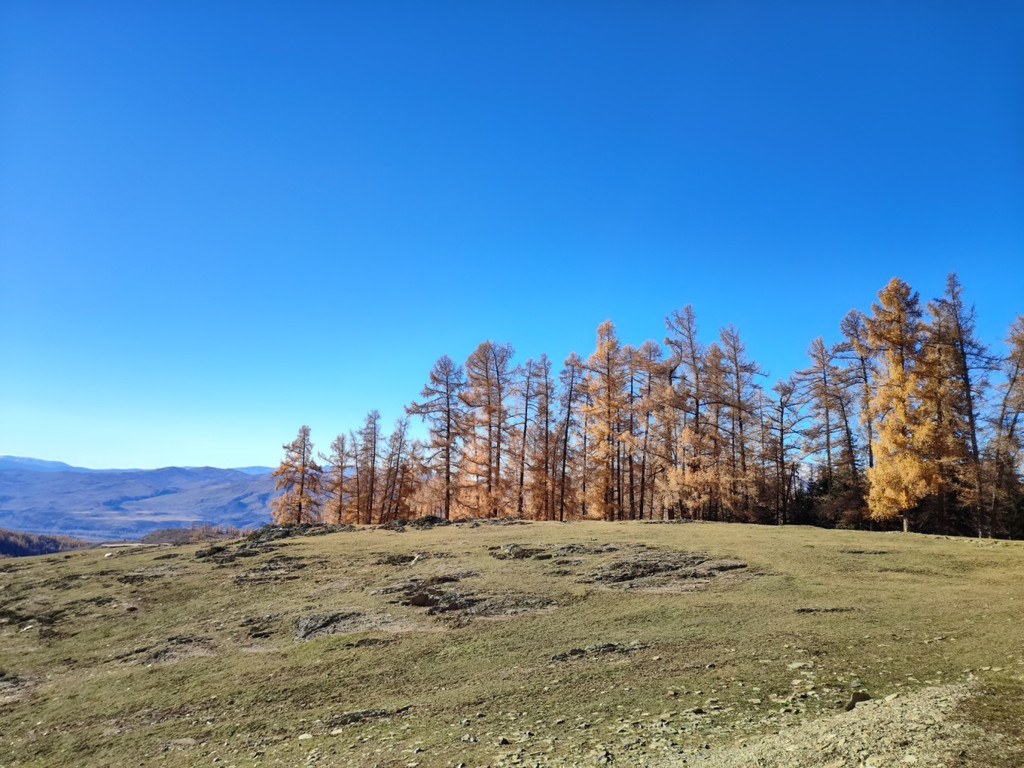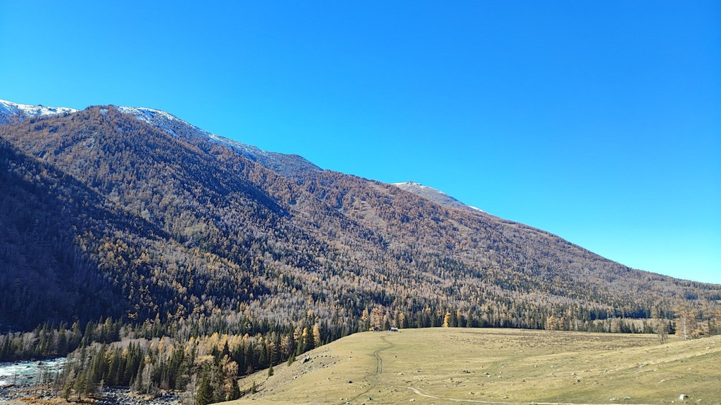 观景台旁边也是一片草原,看着不大,但真的可以走很久,草原北部有成片的金黄色的落叶松。这里真的是一山有四季景啊,春夏秋冬,草场花朵,绿色松柏,黄色落叶松,白色雪山。