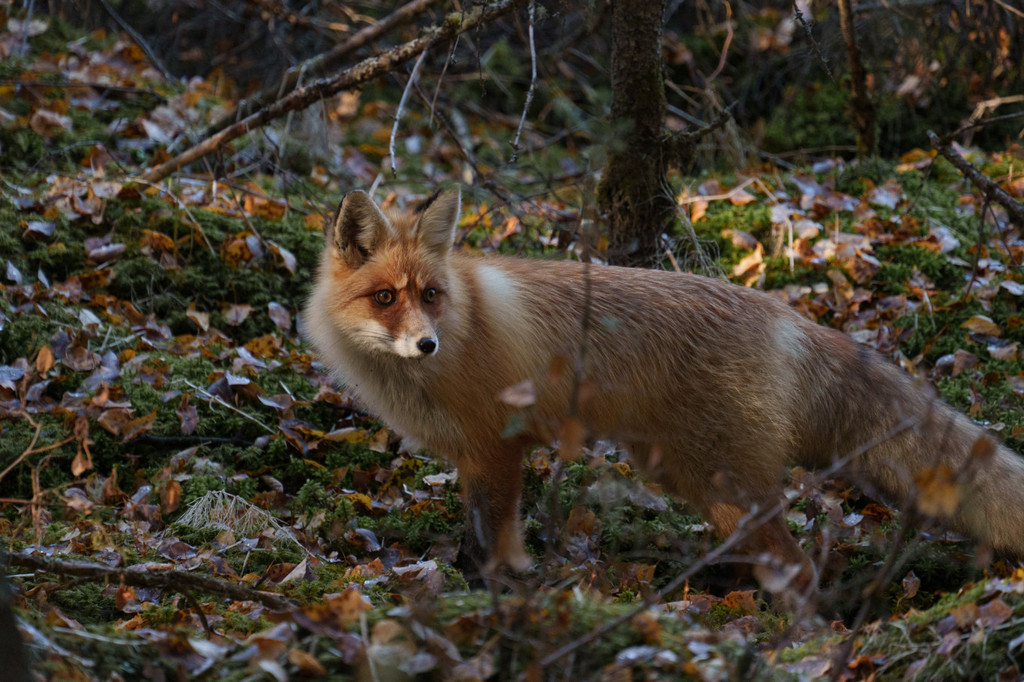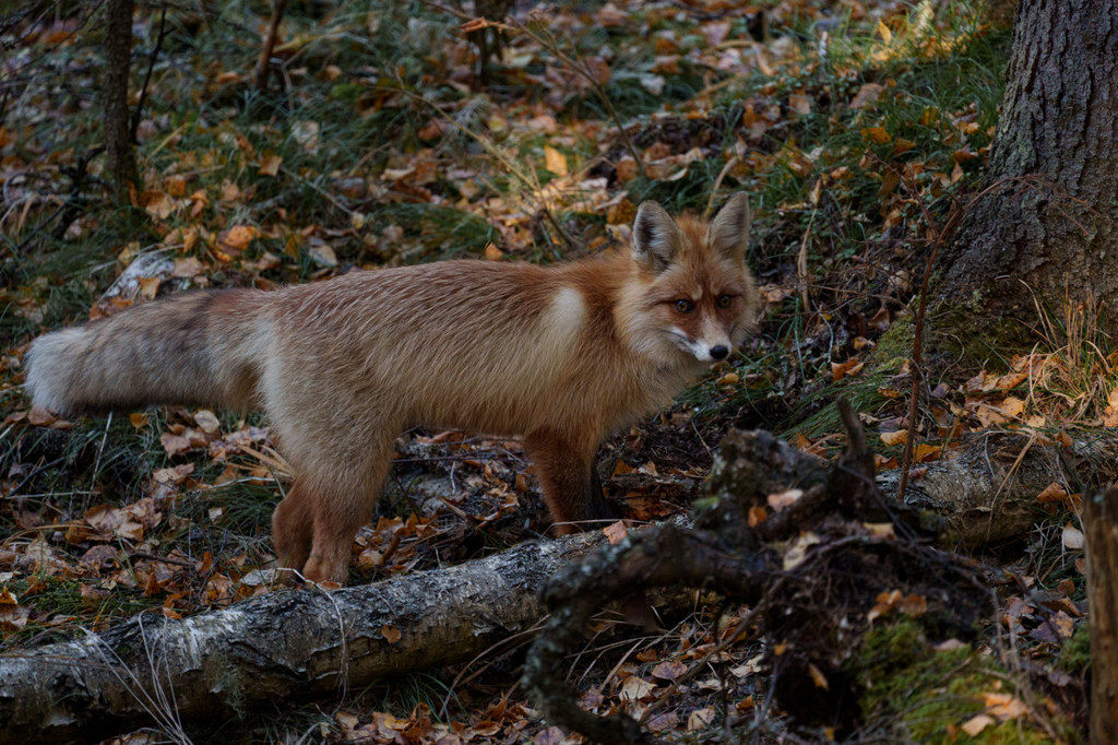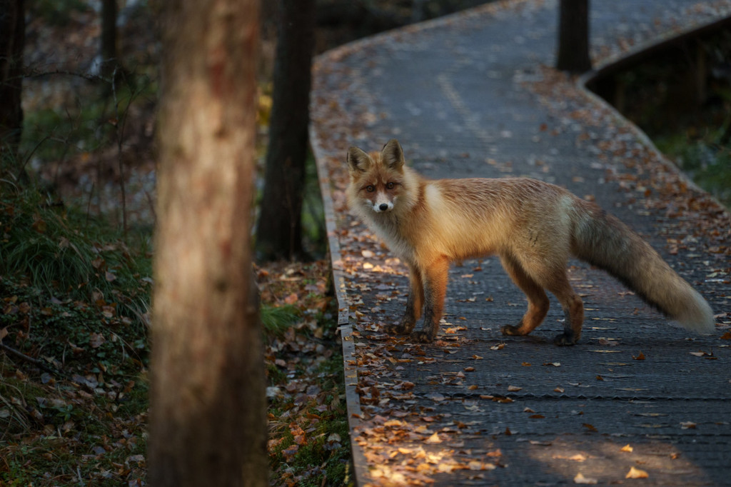 突然,偶遇了一狐狸,正在栈道旁的一树底下一个洞口掏土,估计在捕捉小老鼠?看到我们三个人过来,看了我们一眼,小跑到远处的栈道,回头看着我们,定在那里。我们也停下脚步,对望。狐狸看看我们,看看洞口,又看看我们,再看看洞口,脸上带着犹豫,还有一丝丝哀怨?
