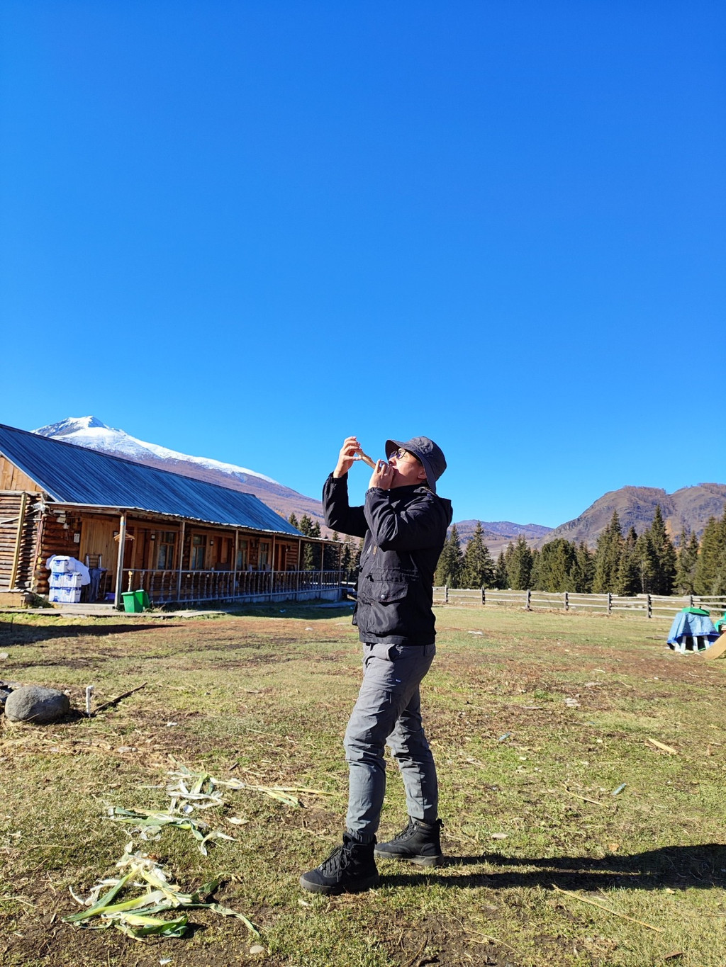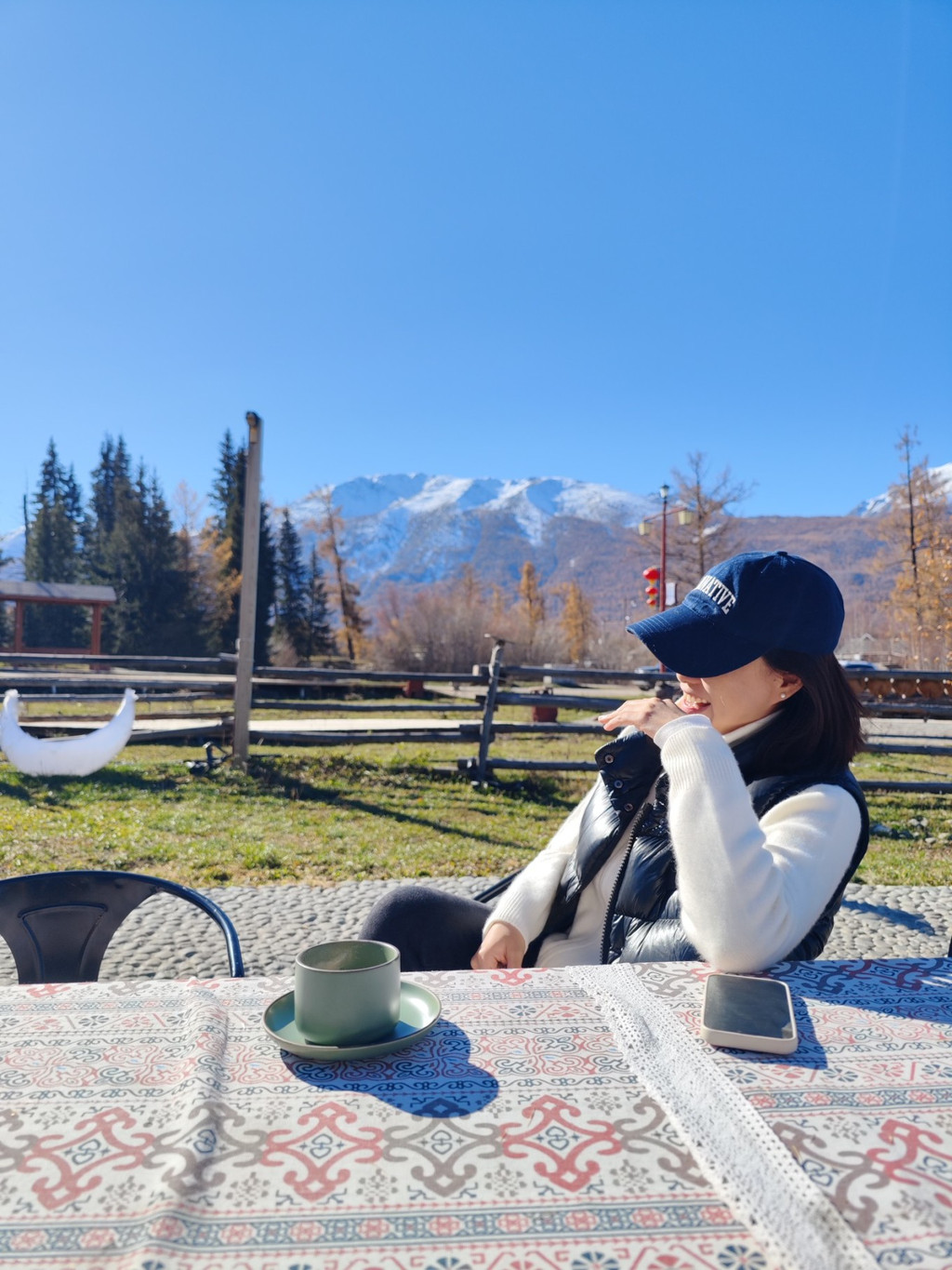 下午我和卡卡要离开 喀纳斯 去 布尔津 县,这会坐在庭院草坪上,翘脚晒太阳,休闲看远方森林雪山,这跟离开 禾木 前如出一辙啊,享受这种休闲惬意的时光。