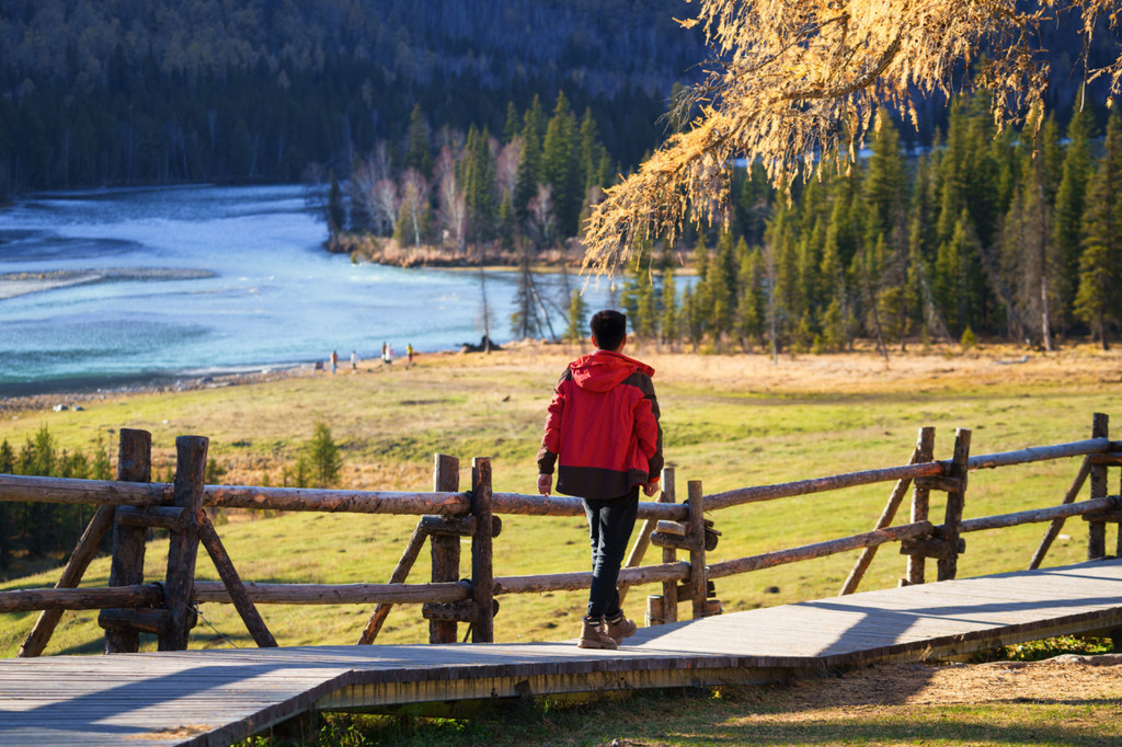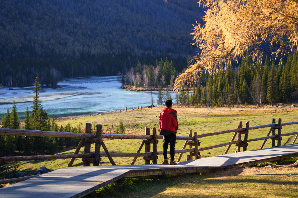 沿着木栈道往前,很快到神仙湾,这里有个角度特别唯美,栈道右前方,有一棵 新疆 落叶松挨着栈道,高大,树叶正金黄。左前方则是栈道围栏,浅碧色草原,湛蓝色河水,深绿色松林,傍晚的阳光倾泻而下,柔和却亮,且不刺眼,感谢卡卡拍摄的大片。