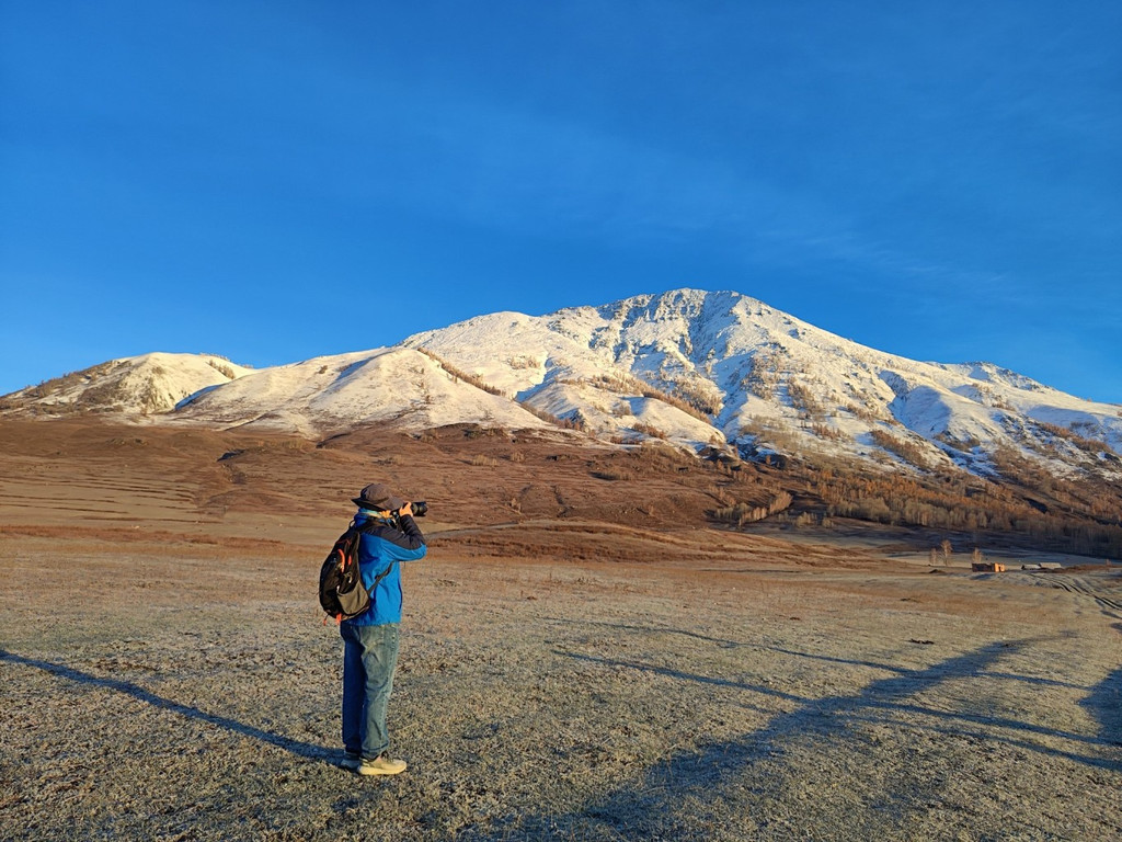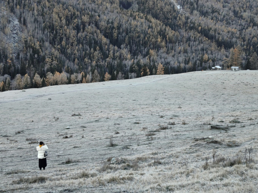 禾木 四人组,忙活得很,大张蹲下来拍栈道冰霜亮晶晶,小张远眺雪山发发呆,卡卡航拍正忙。