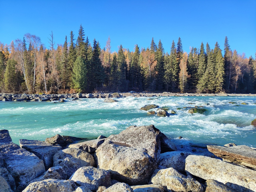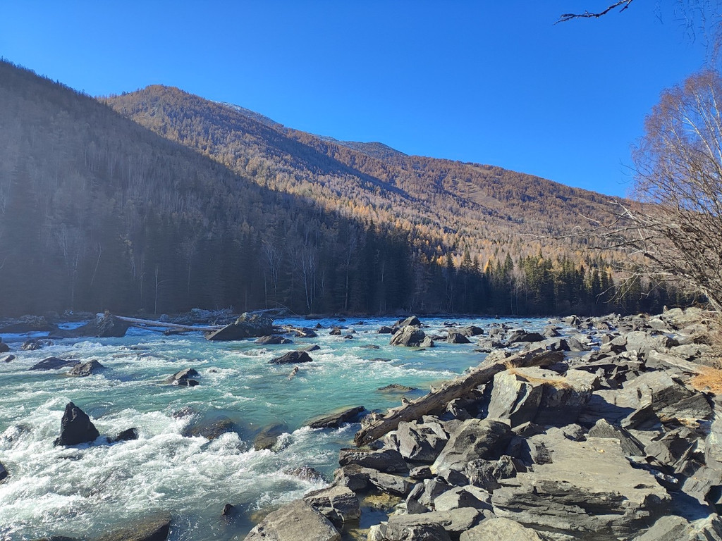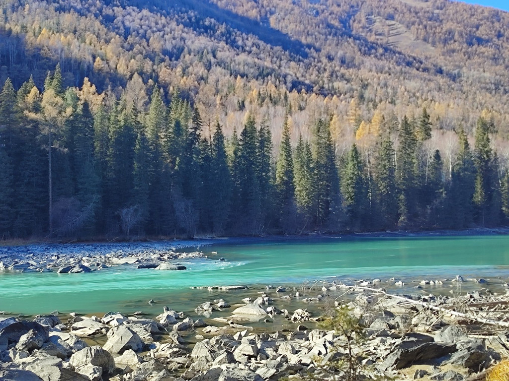 从草地旁的斜坡下去,有木栈道,挨着 喀纳斯 河。河水碧绿色,哗啦啦穿过石头,溅起白色水花。雪水化成的河流,都这样么?冷冽,清澈。沿着木栈道往前,沿路可以看到河岸成片的鹅卵石,绿色平静的河水,还有对岸茂密的森林,有绿色松树,也有黄色落叶松,光秃秃的白桦树。