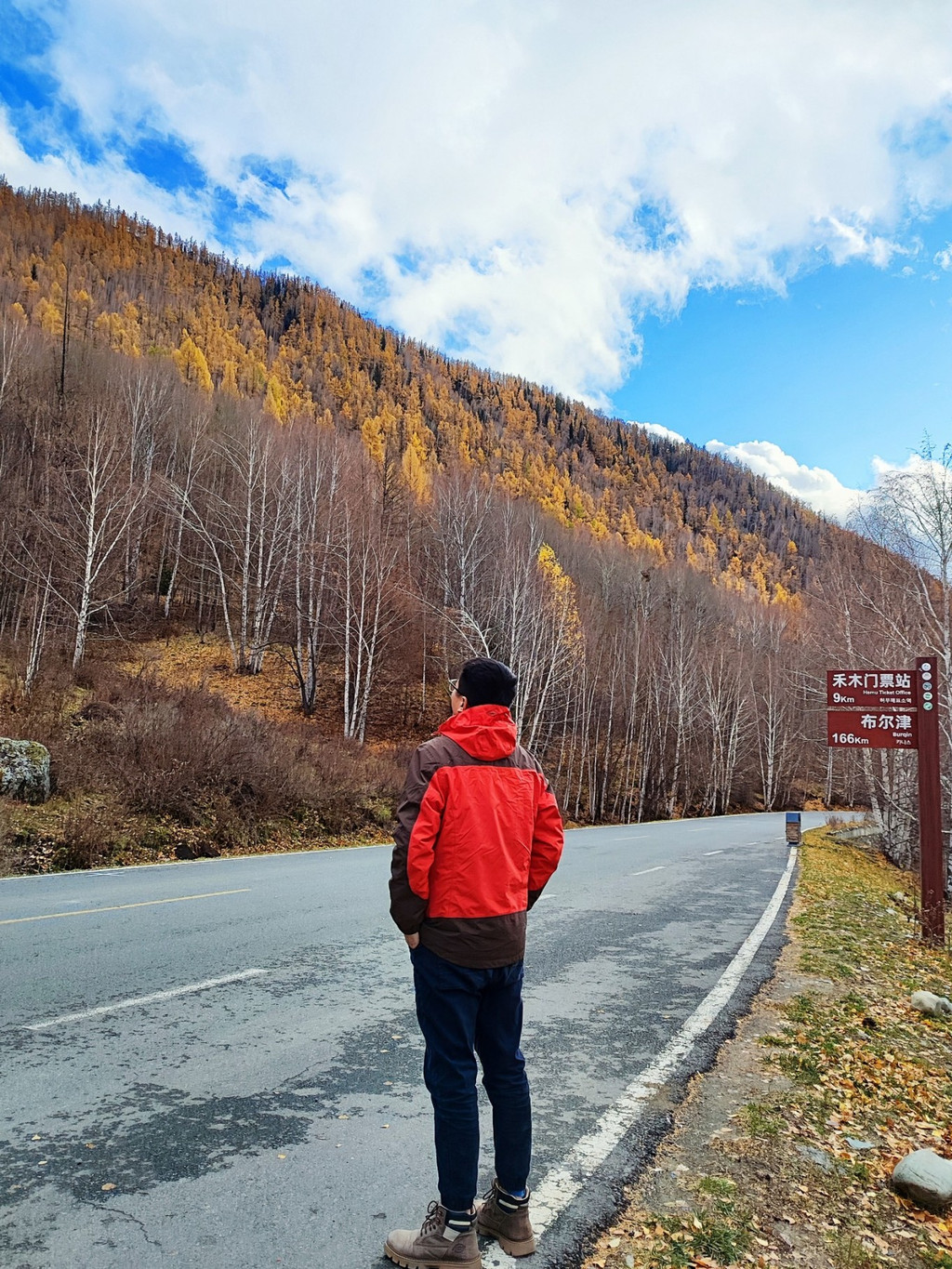 小张扛不住七拐八弯,中途停下歇息,刚好这段路让我们欣赏到了 禾木 的第一抹秋色。山脚下,白桦树大多光秃秃,但半山坡上,还是黄灿灿的一片。在马路边仰望这片树林,感受 北疆 的秋。身后有草原,远处连着树林和雪山,景观丰富,很有层次。