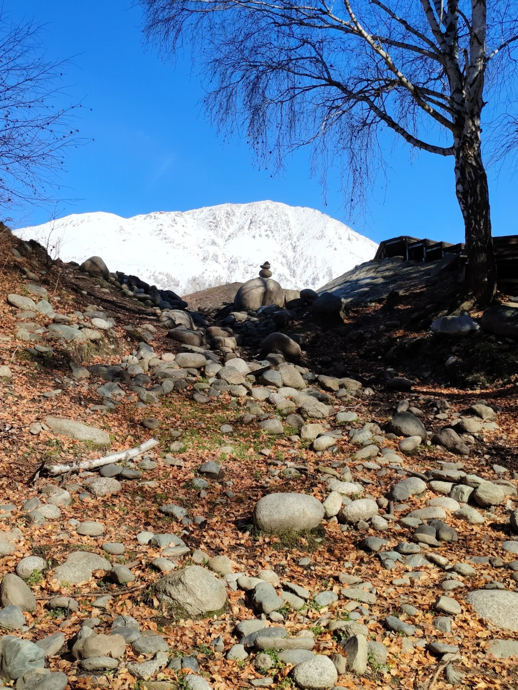 中午下山,沿着木栈道走到山脚,有一小片斜坡,好多大号鹅卵石,还有青苔,应该是小河道,只不过目前没水。这小片天地,秋意很浓,遍地落叶,光秃秃的白桦树干白得发亮,绿油油的松柏树叶绿得盎然。