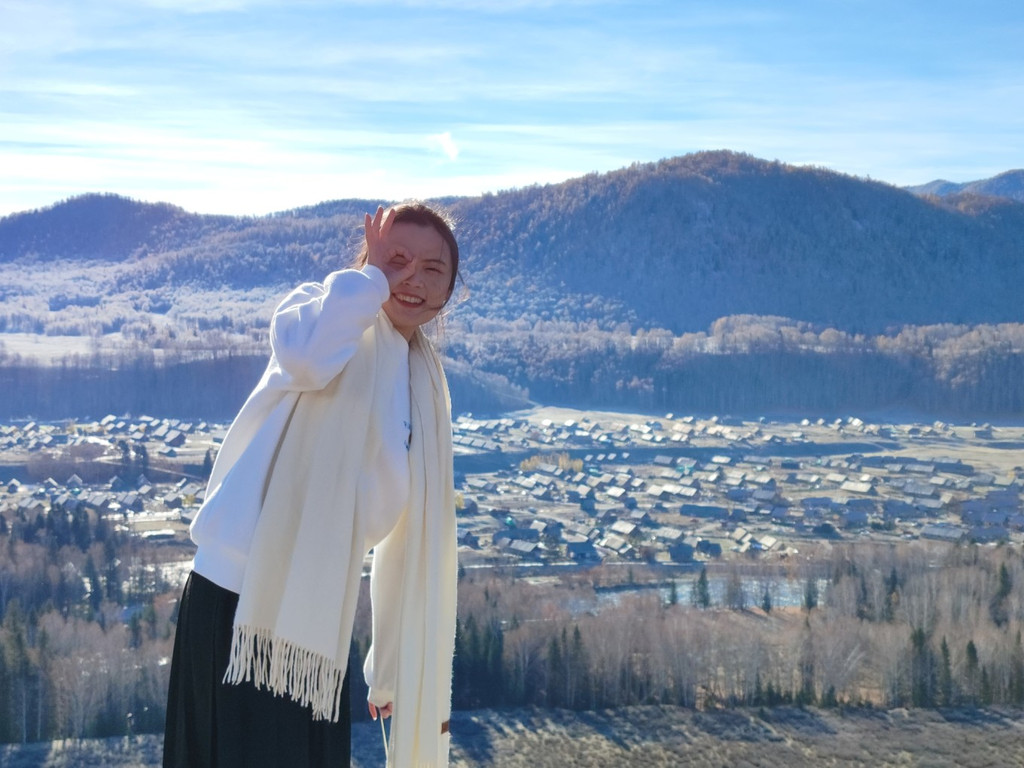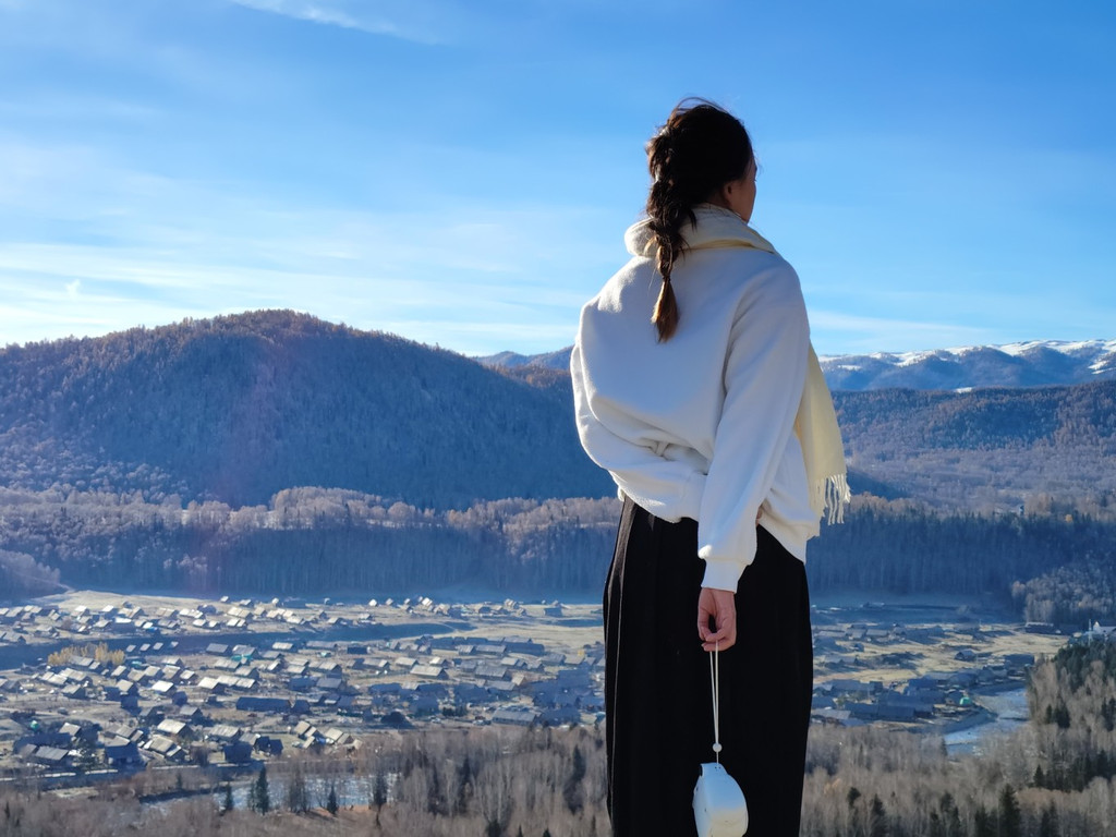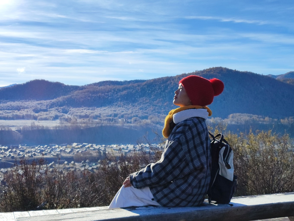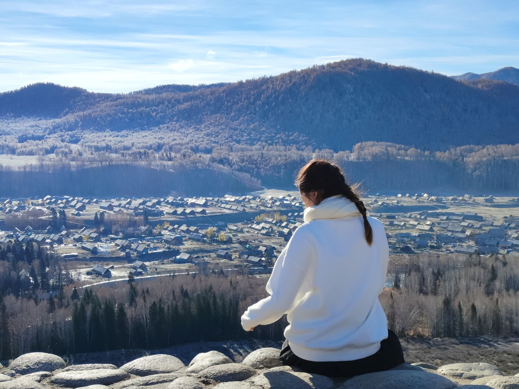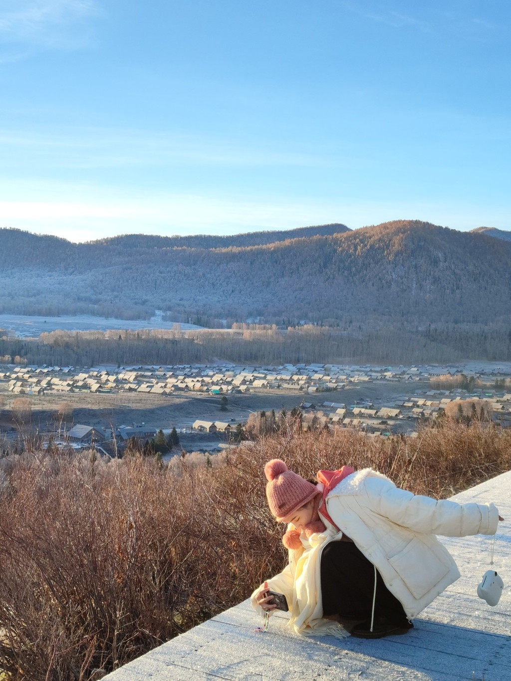 旁边还有 禾木 的石碑,这里能很清晰地俯瞰整个村庄,很适合合影。模特大张再次上场!