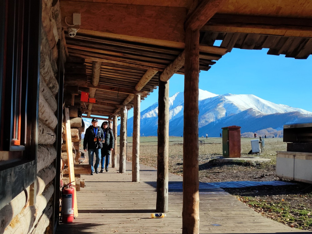旁边有木屋,小卖部和旅拍店等全部关着门,淡季估计不营业了,也好,这一块就没那么热闹,略微冷清的氛围跟周边景观更加协同。总感觉高山木屋,草甸雪山,特别地搭。