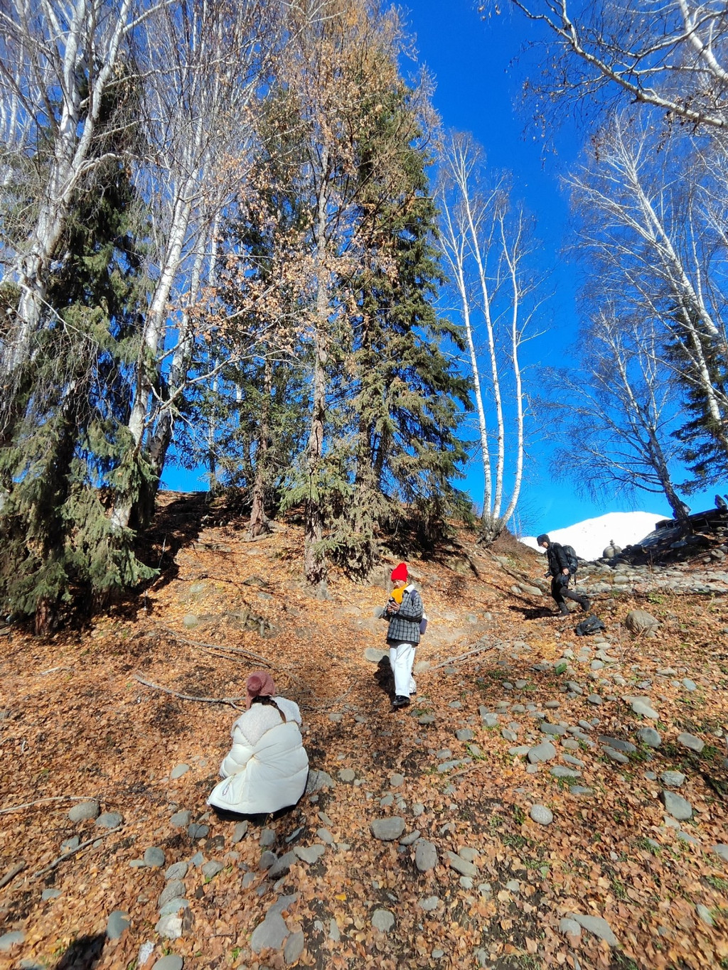 2个小时出头,终于到达 禾木 ,这段山路,七拐八弯真不容易走。入住民宿,淡季一间三四百元。出来村里闲逛,找地吃晚饭,偶遇有一小片白桦林,满地金黄,有木栈道,行走其间,感慨下,我终于也到 禾木 村啦。