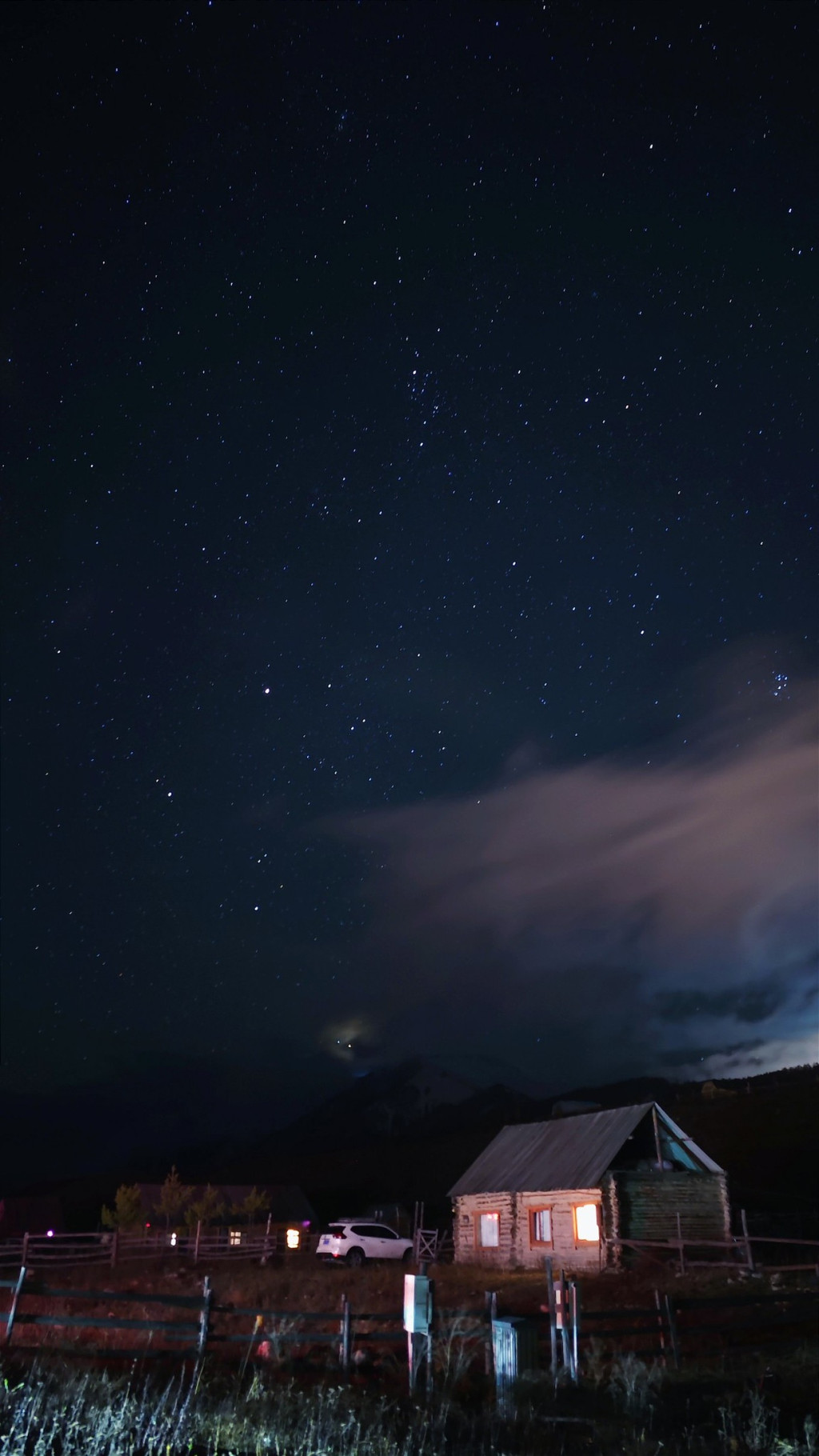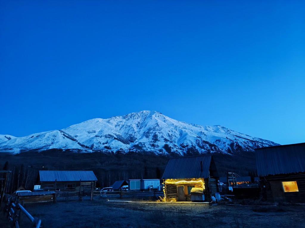 8点出发,天还黑着。亮着灯的木屋和雪山,特别有意境,静谧,祥和。