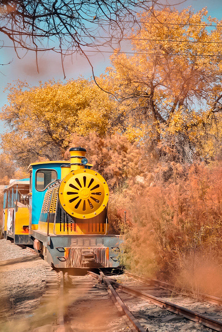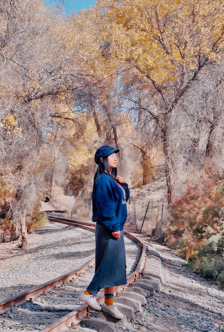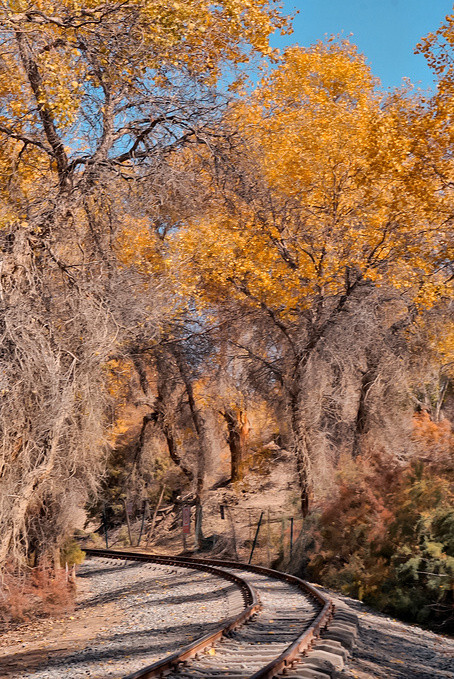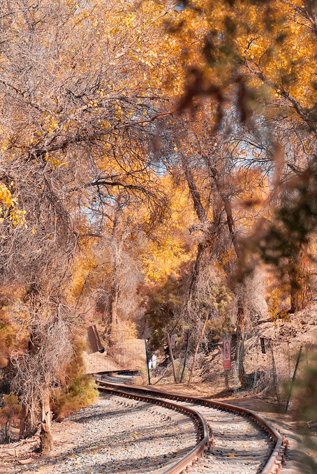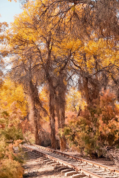沿着环形游览小铁路往胡杨深处走,你会发现,在湛蓝天空下的胡杨,在阳光的照射下,金黄的颜色更加夺目,满是岁月痕迹的金黄胡杨和小铁路,共同组成一幅五彩斑斓的油画。走在满是金黄的小铁路旁,满目都是美。