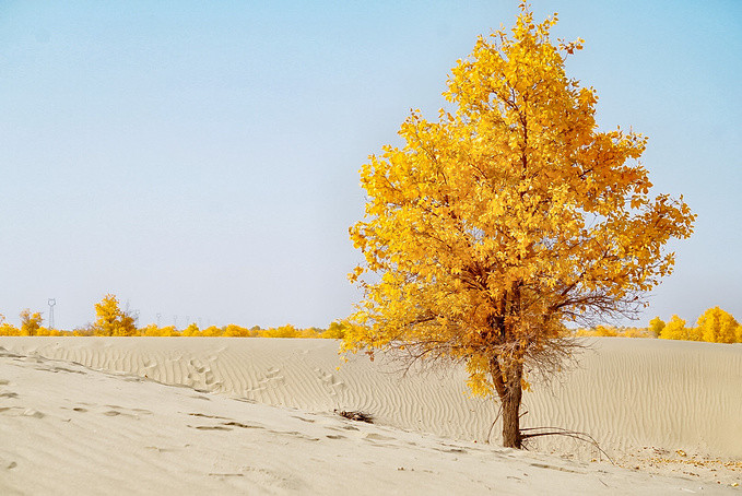 在塔克拉玛干沙漠里,胡杨和沙漠相互守候着,,金秋十月的胡杨,褪去了青涩,展现着金黄的色彩。金黄的胡杨点缀其间,加上沙漠起伏的沙丘线条,不管什么时候看都是一幅美丽的风景画。