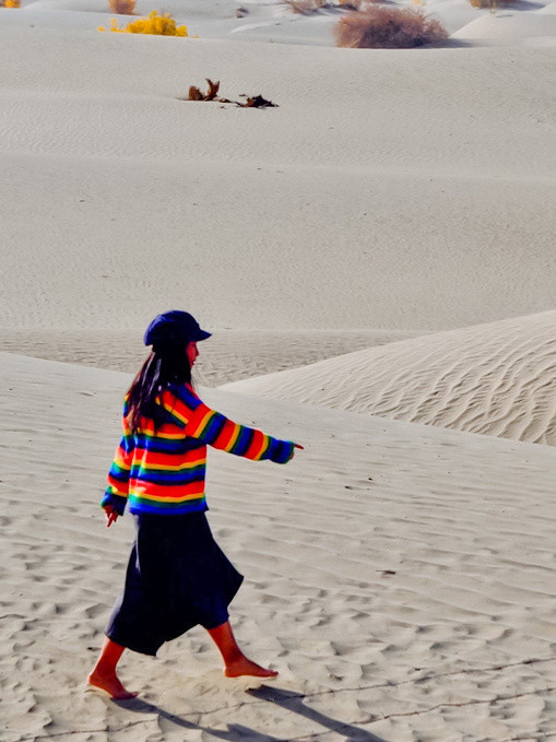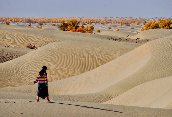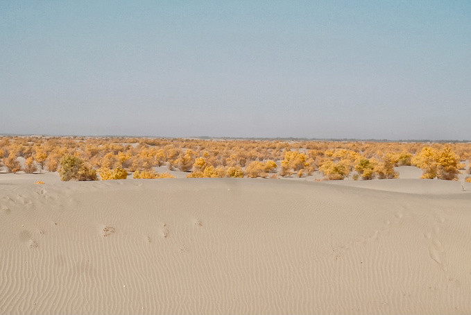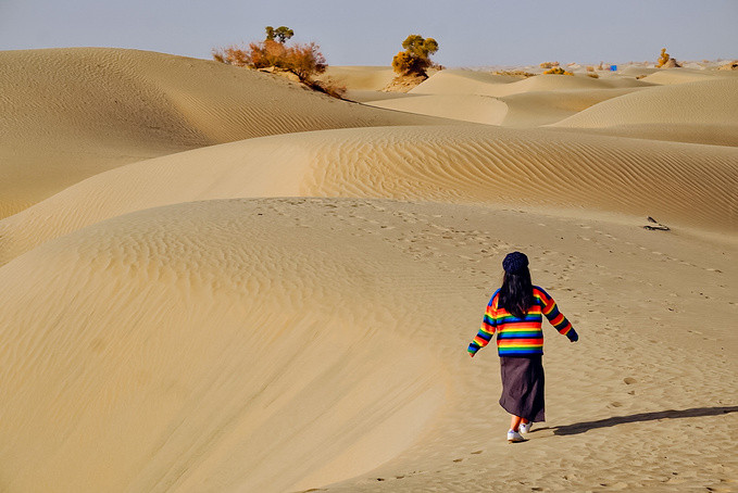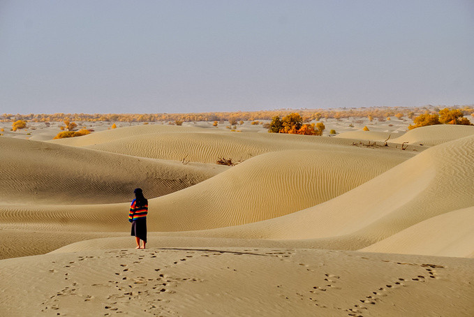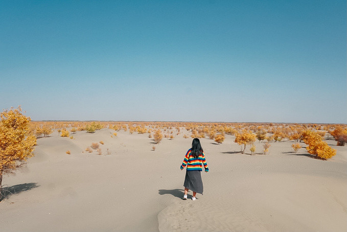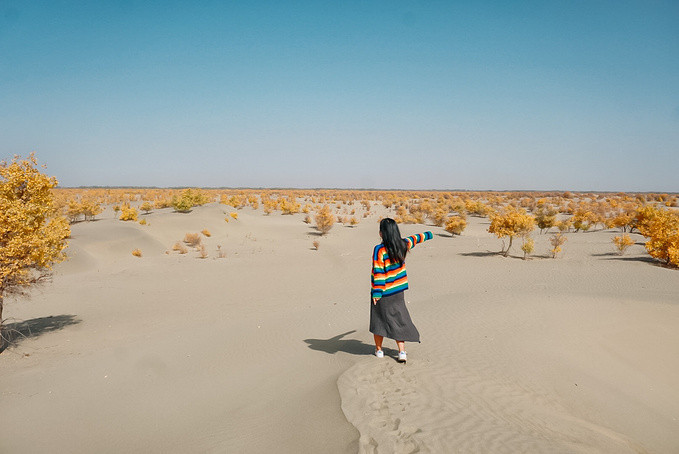 随着车子越往前,就感觉进入到沙漠深处,环顾四周都是茫茫沙漠。我们找到一个可以停车的观景点,忍不住走进沙漠里,行走在沙漠中,在绵延沙丘上留下一排排脚印。头顶是无尽的蓝天,远处的胡杨在抖动着金黄的叶子,满目都是秋日的色彩。在这看不到尽头的沙漠里,感受到大自然的神奇,自己的渺小以及放松的自由。