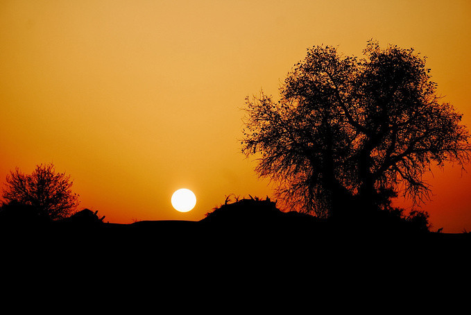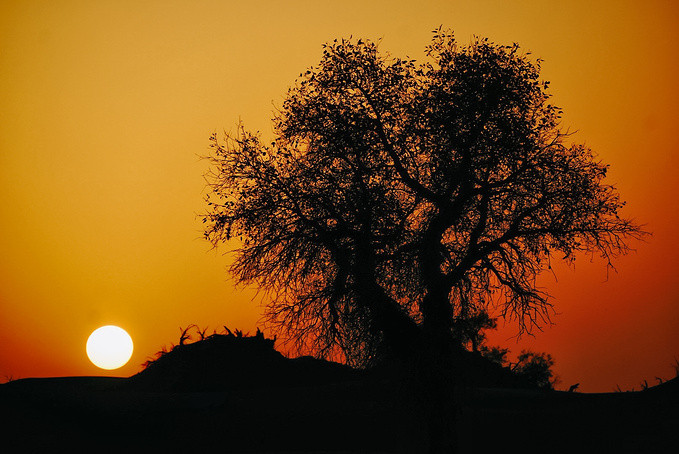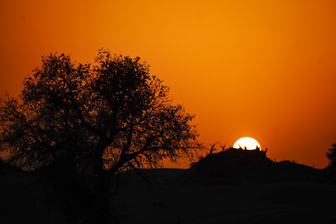 看着太阳从西方的沙山上落下、消失光芒,眼前的胡杨以及远处起伏的沙丘,构成一幅安静的图画。