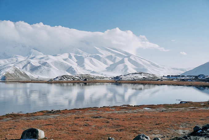 当高原雪山遇上金秋十月,是帕米尔高原最绚丽的时节。蓝天白云下的慕士塔格,银色的雪顶,看起来特别耀眼。位于慕士塔格峰脚下的卡拉库里湖,不算很大的一个湖泊在冰峰雪岭环抱下,增添了神奇而迷人的色彩。