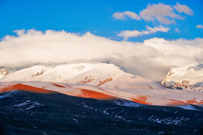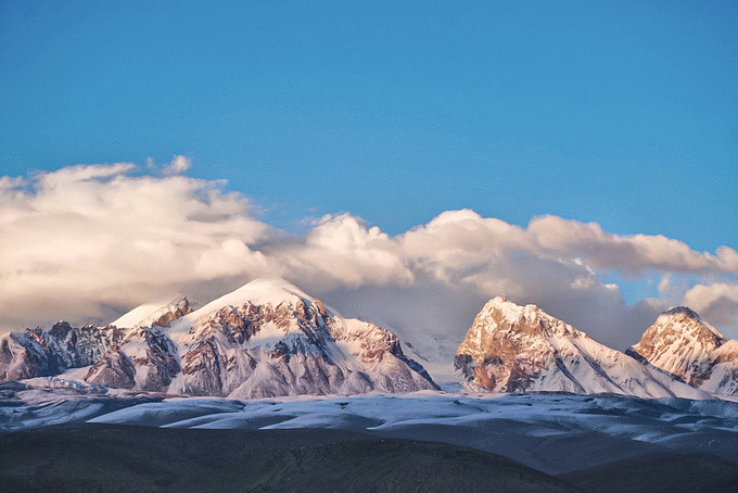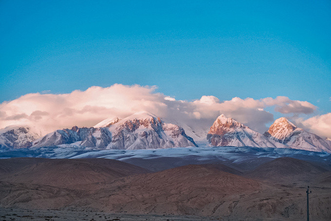 遇上日落时分的帕米尔高原,天空又换了另一种颜色,雪山也变得特别温柔,目睹了夕阳下雪峰的绝美风采。在别处难得一见的日落金山,在这里却真真实实的可以看到,看到这样的自然美景,浮躁的心也安静了下来!