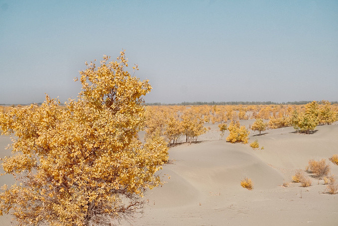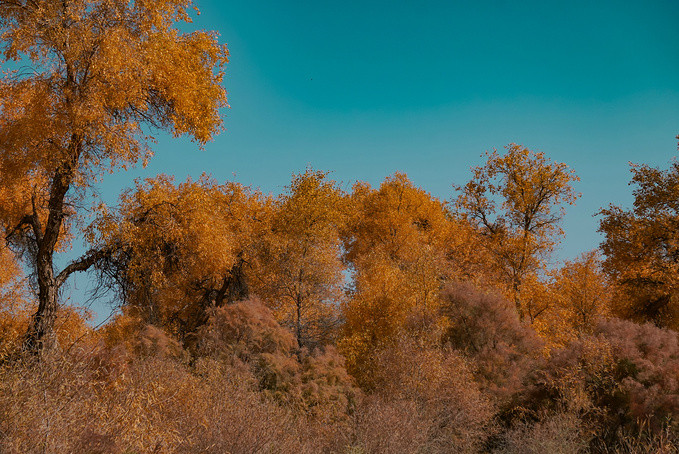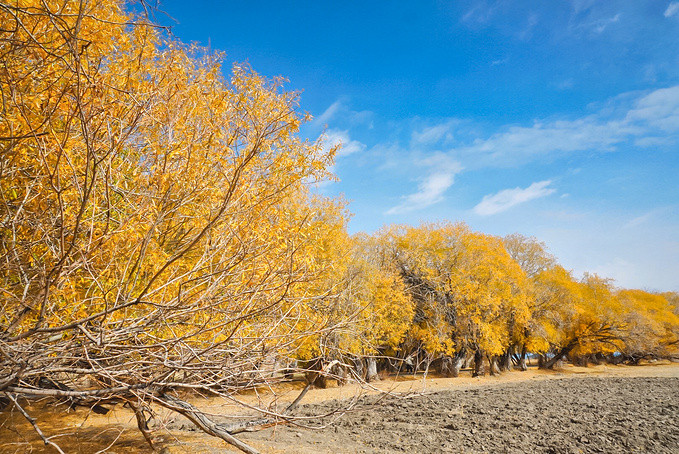中国90%的胡杨在新疆,而新疆90%的胡杨在南疆。每年的金秋十月,塔里木河就变成一个童话的世界,目光所及,金黄一片。