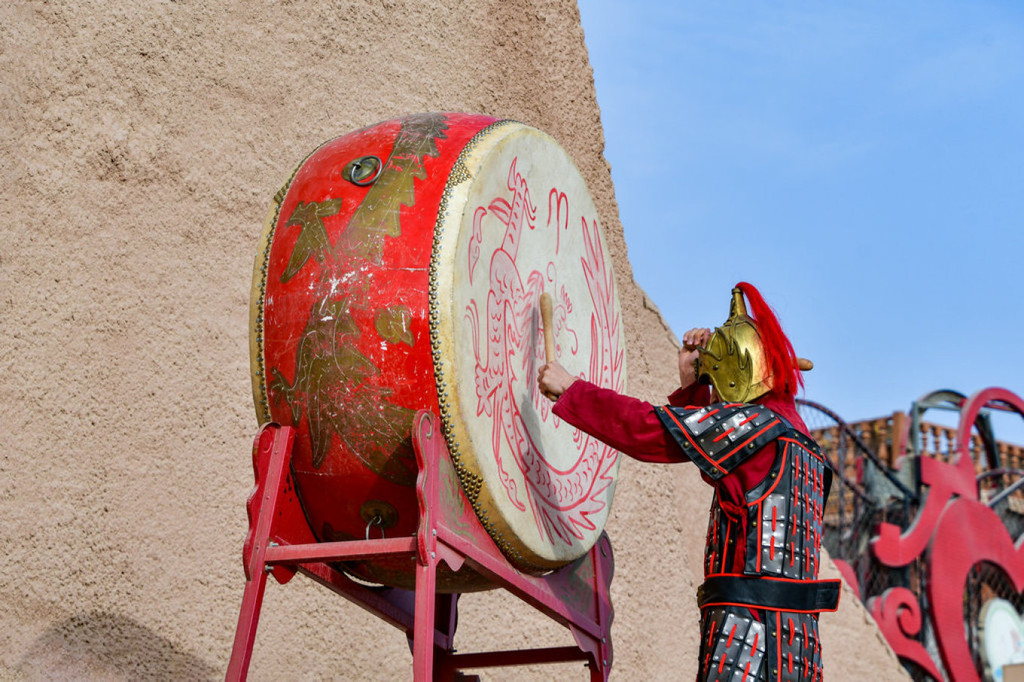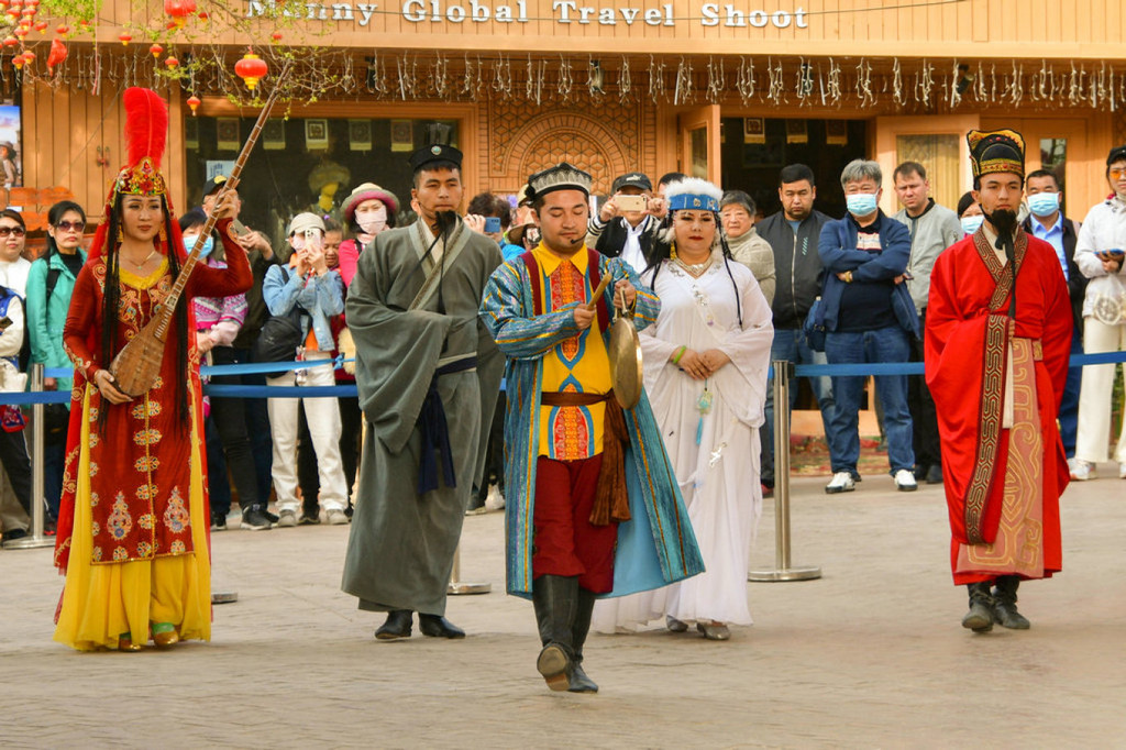 开城仪式,会有主持人介绍喀什古城,乐手吹响号角,