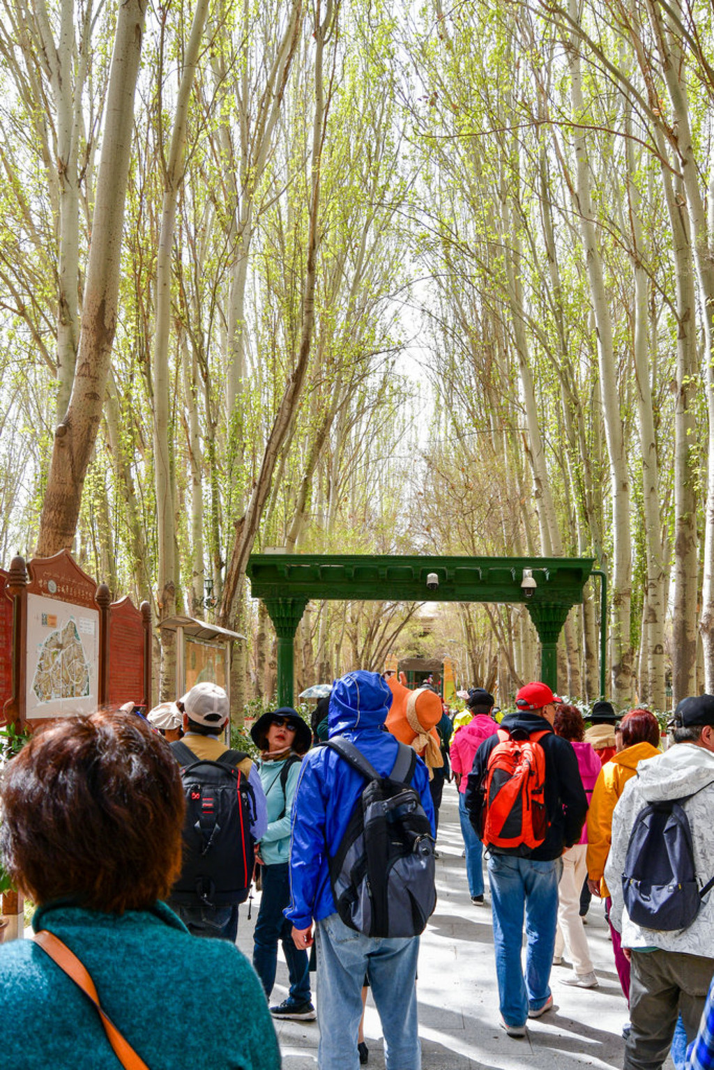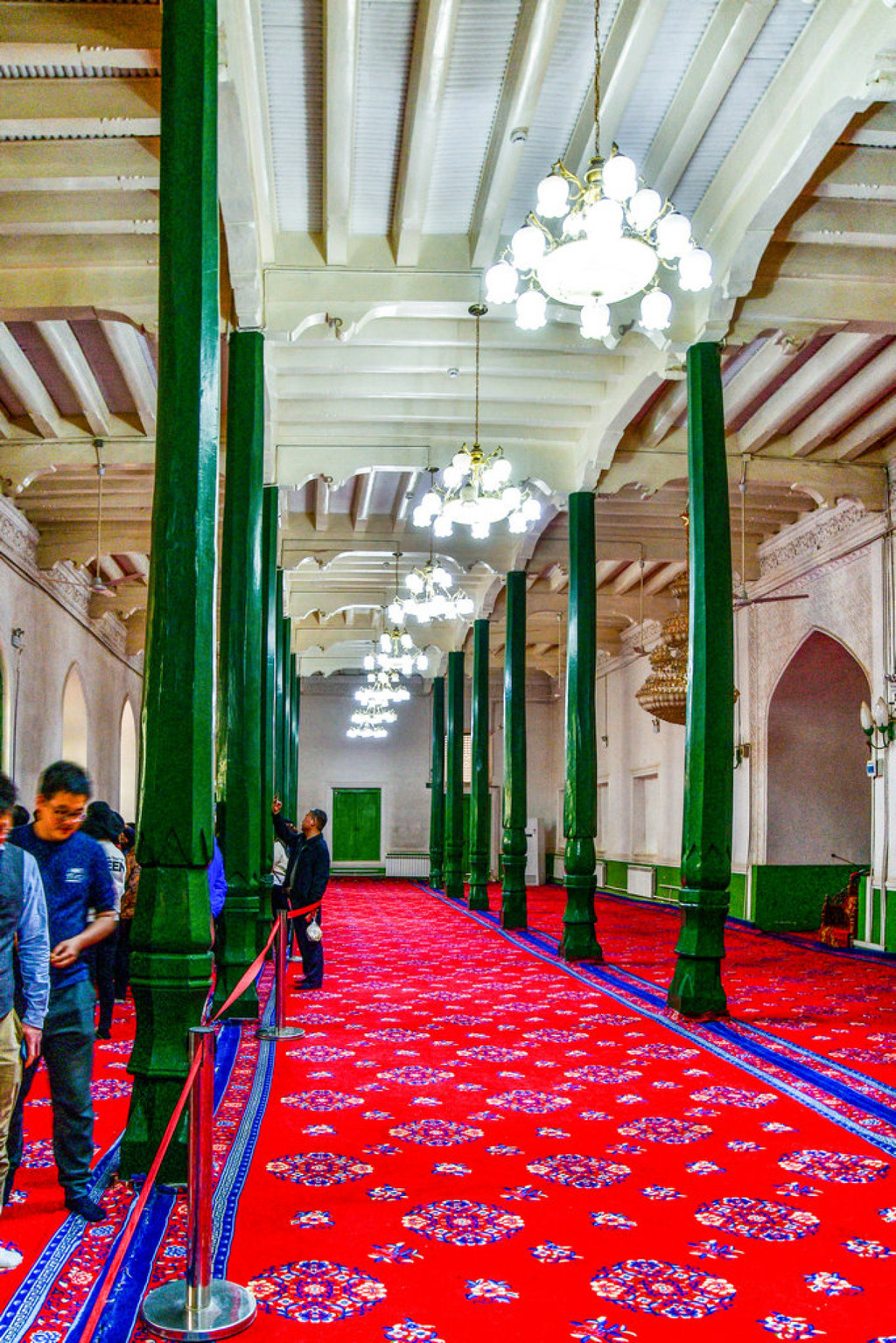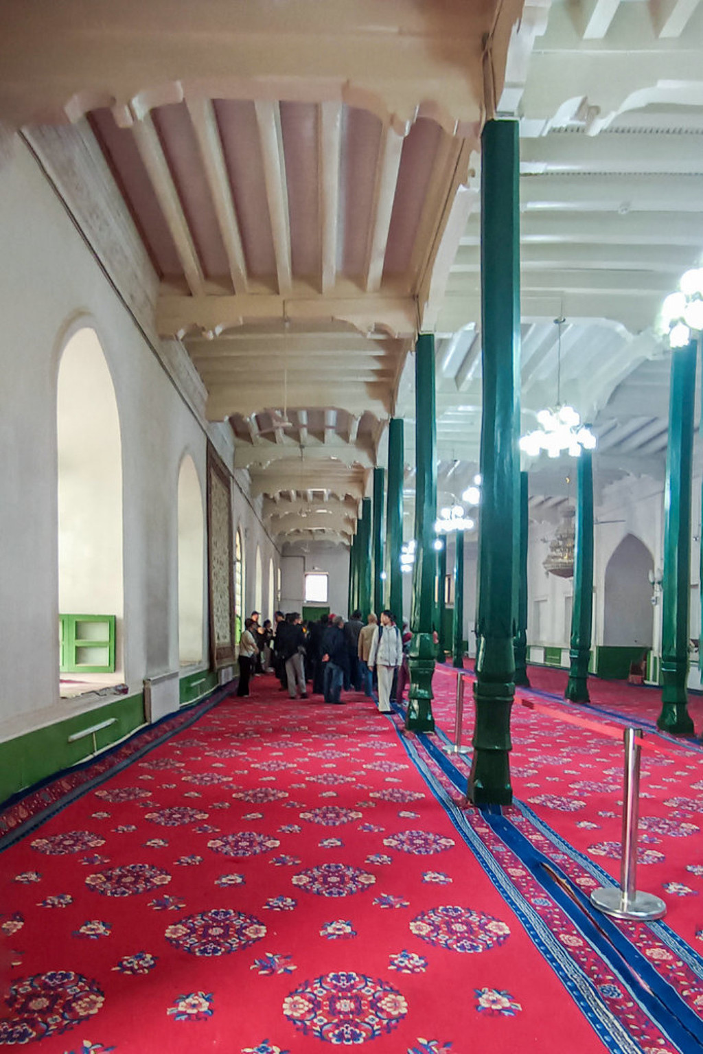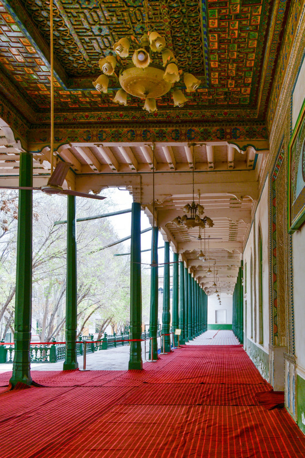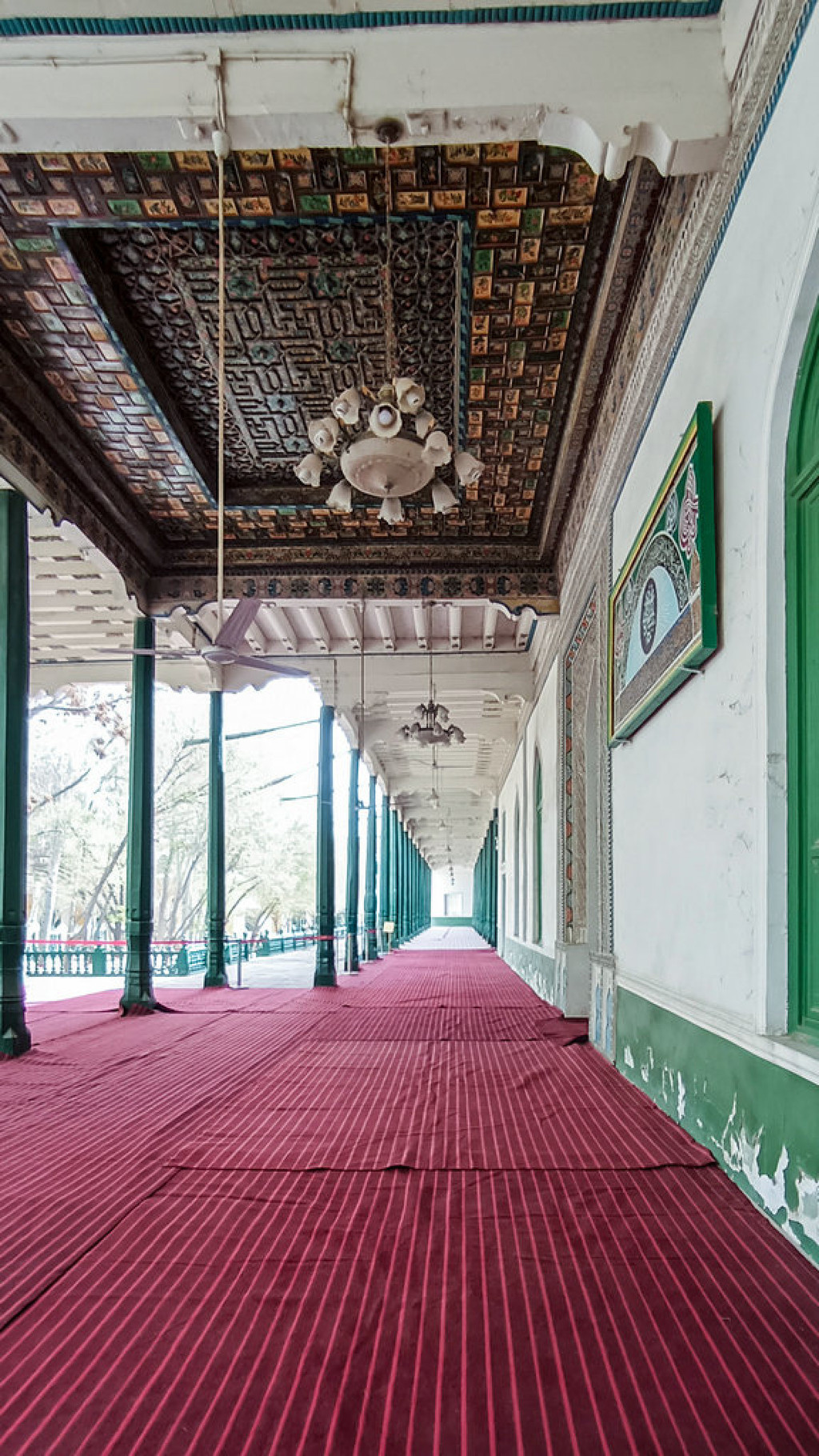 艾提原清真寺里面绿树婆娑,安宁静谧,所有人都是细声的说话,主通道南北两侧各有一排18间的经堂,为伊玛目讲经和宗教学生习经之所。园内设有两个水池,四周白杨参天,桑榆繁茂,虽居闹市中心,寺内却格外清静幽雅。