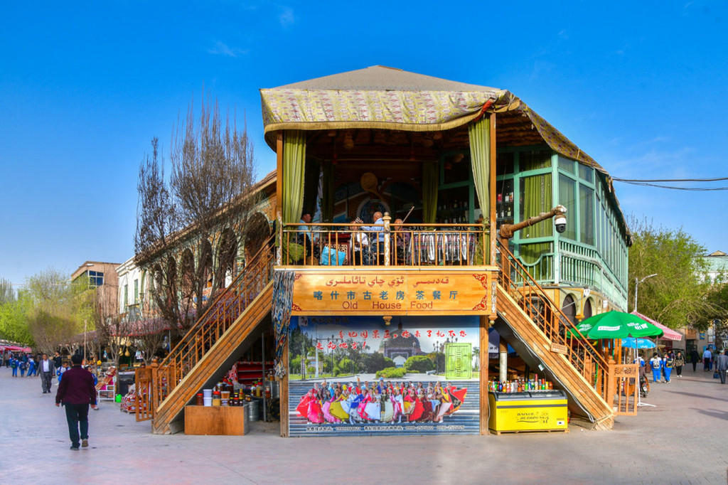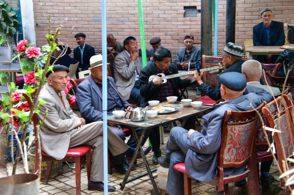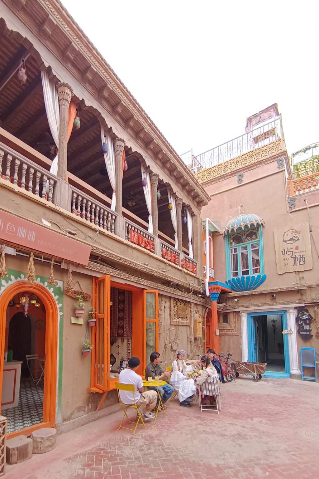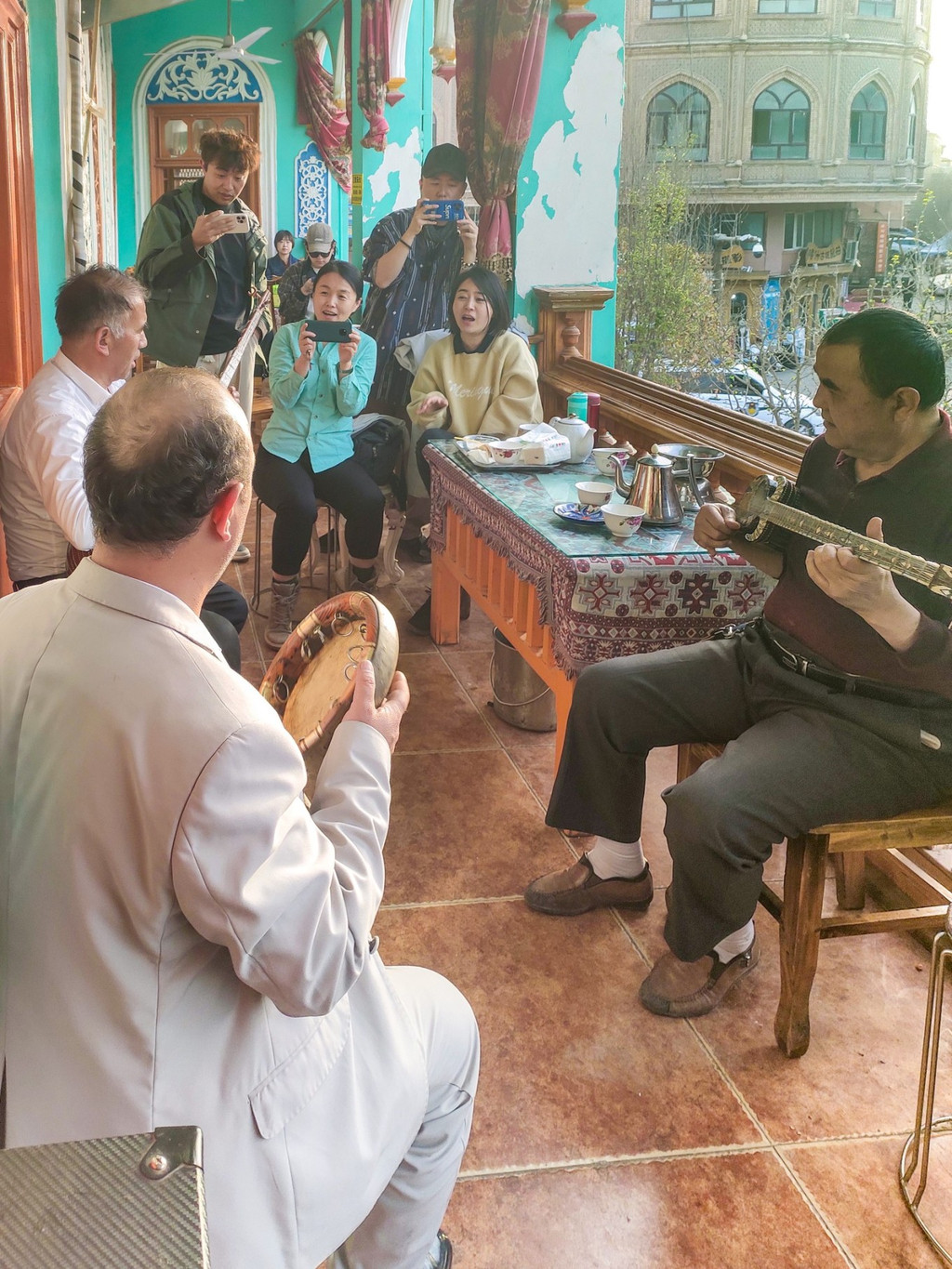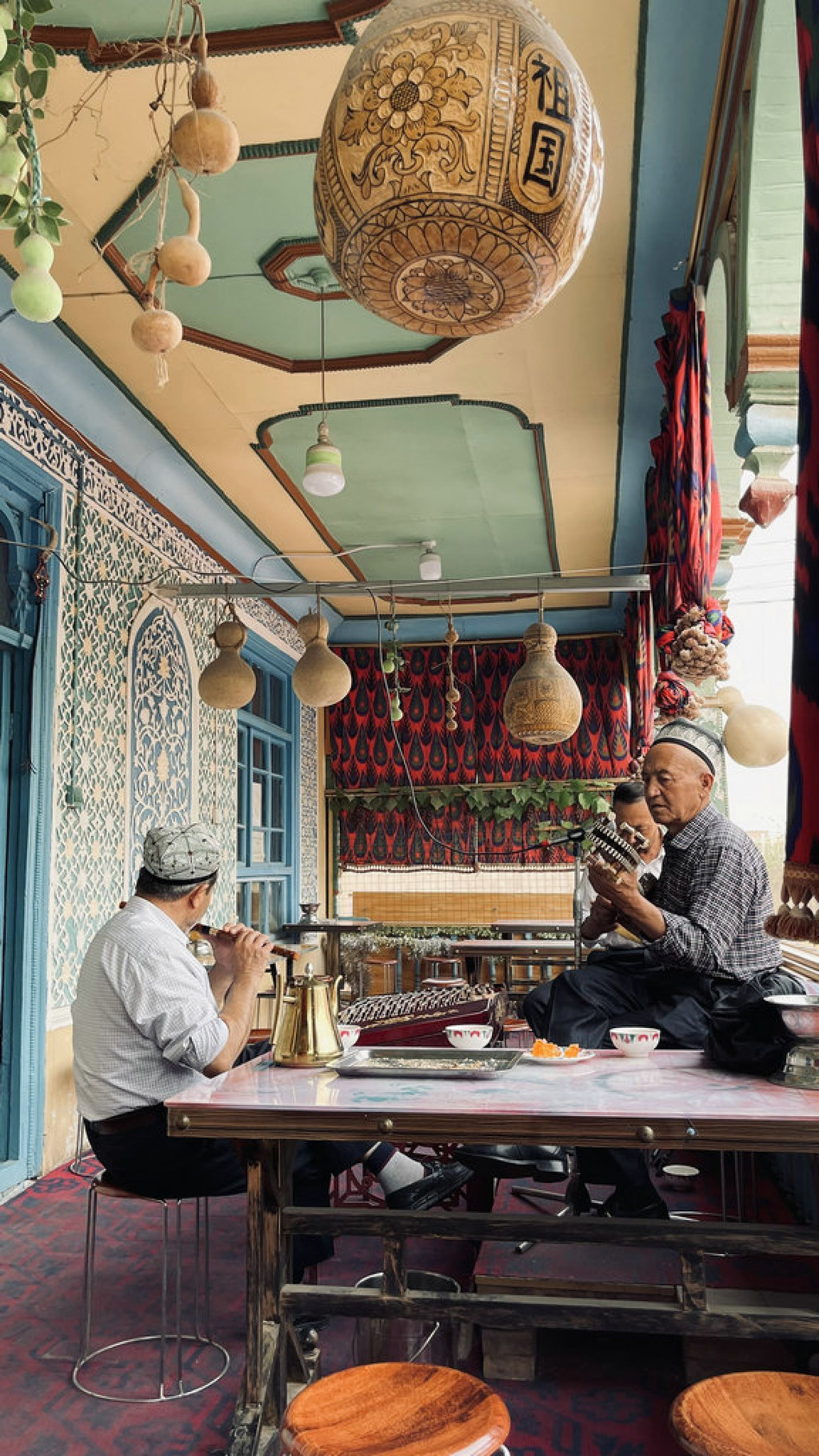 吾斯塘博依路街口的老茶馆也是游客热衷造访的地方之一,这座两层楼的茶馆承载着太多的故事,现在依旧是当地人日常生活不可或缺的场所,很多维族老爷爷会每天来这里喝茶,经常有弹布尔和手鼓艺术家在阳台上弹奏唱歌跳舞,还会热情地教游人们打手鼓、邀请游人们加入跳舞。