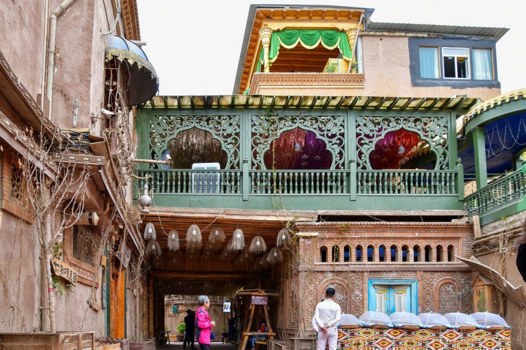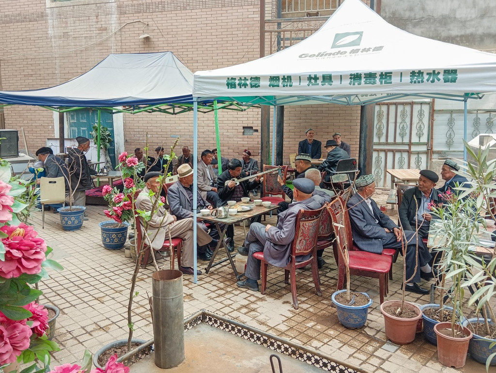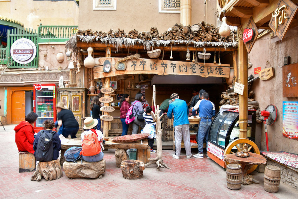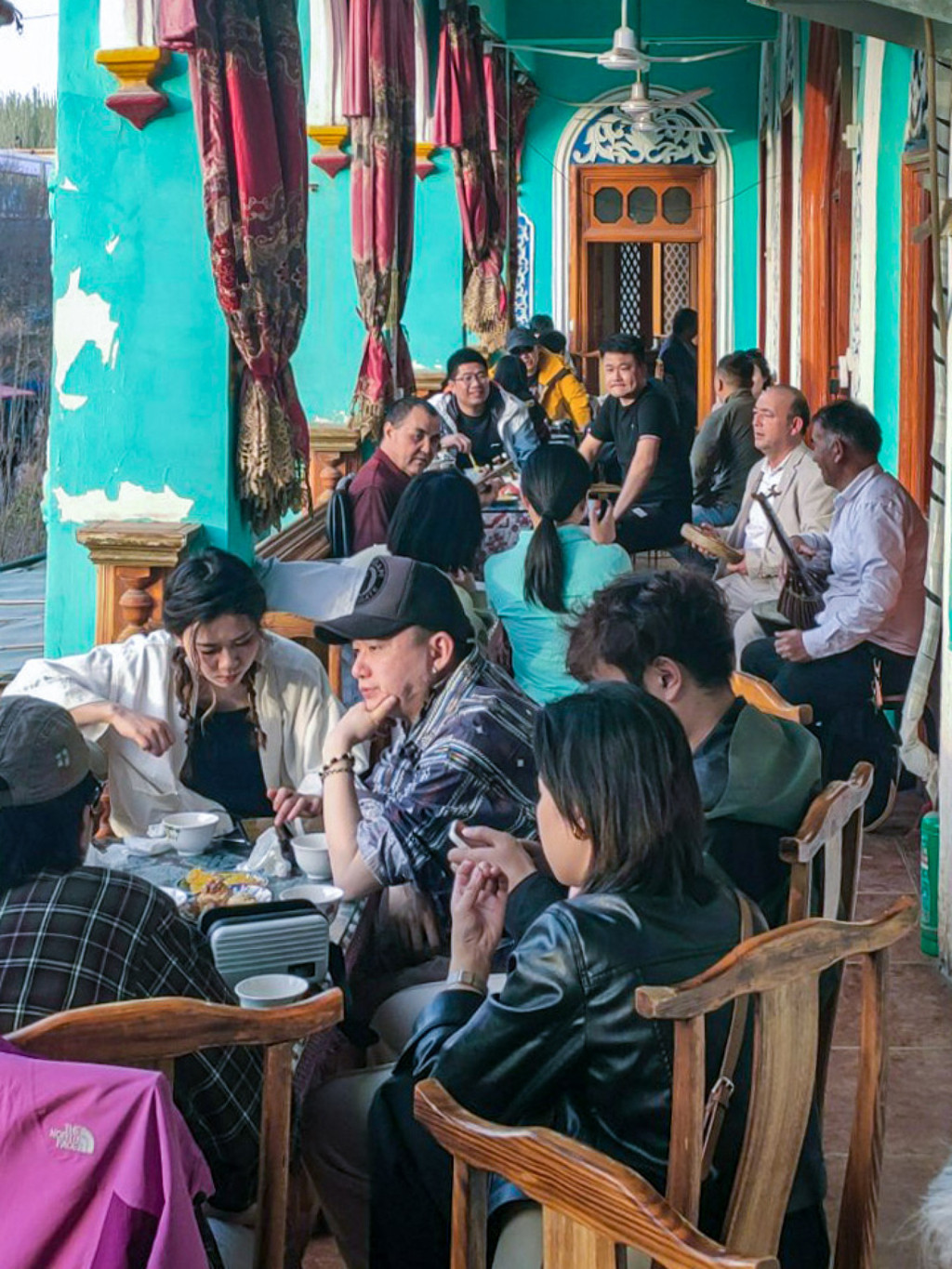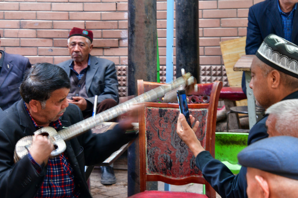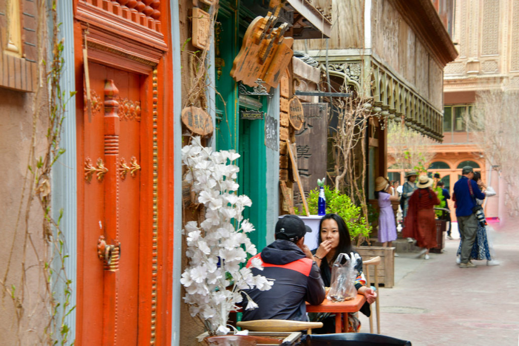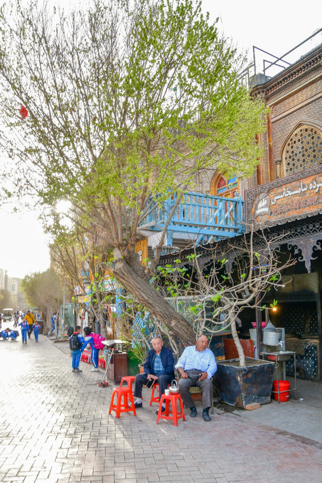 吾斯塘博依路街口的老茶馆也是游客热衷造访的地方之一,这座两层楼的茶馆承载着太多的故事,现在依旧是当地人日常生活不可或缺的场所,很多维族老爷爷会每天来这里喝茶,经常有弹布尔和手鼓艺术家在阳台上弹奏唱歌跳舞,还会热情地教游人们打手鼓、邀请游人们加入跳舞。