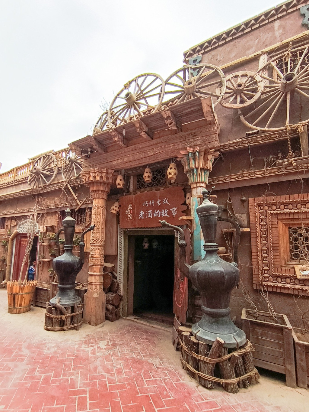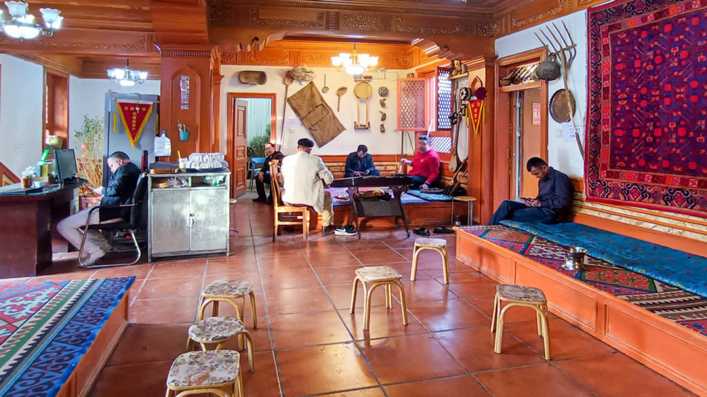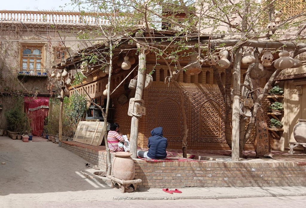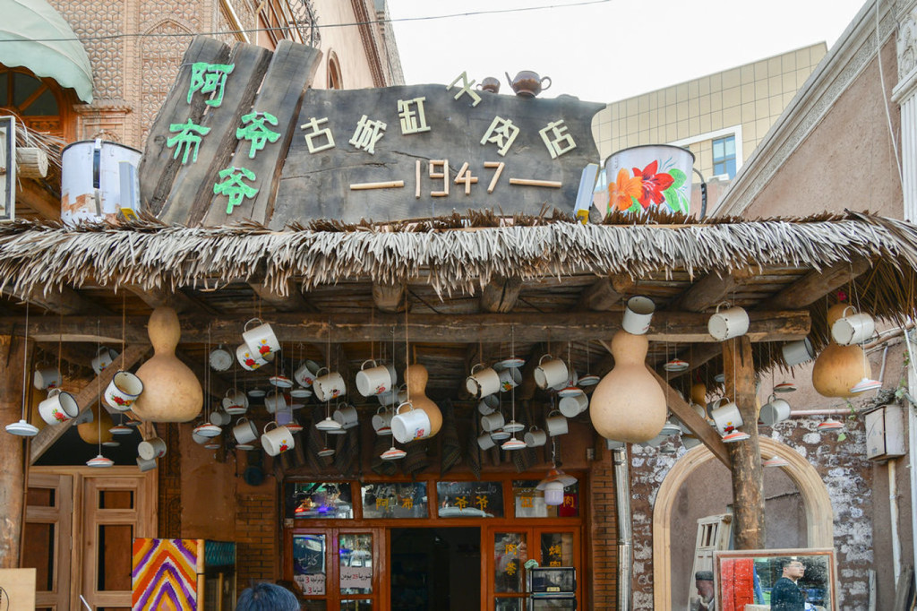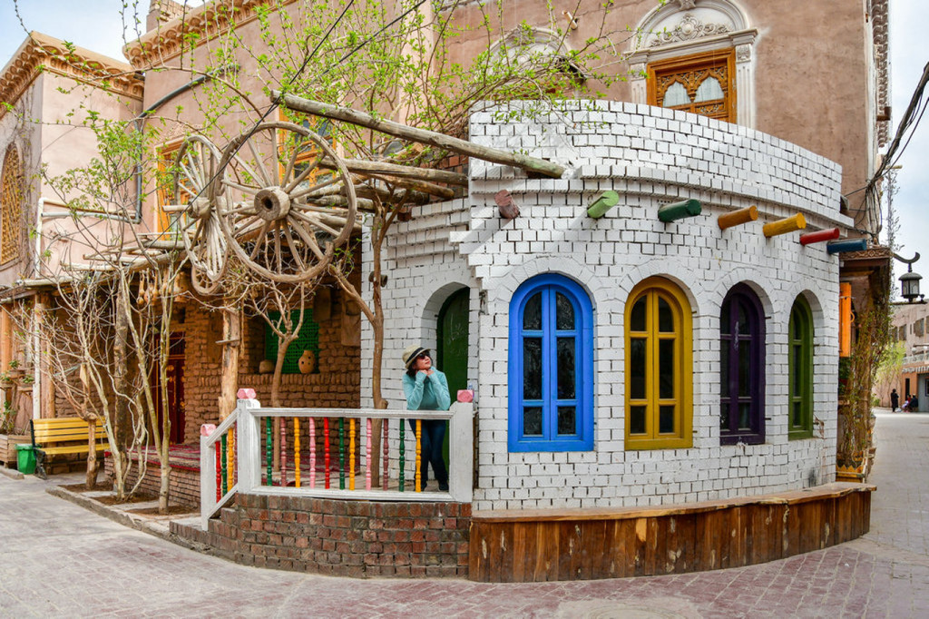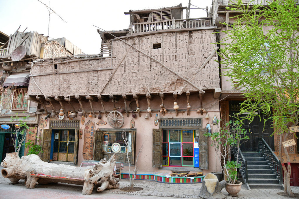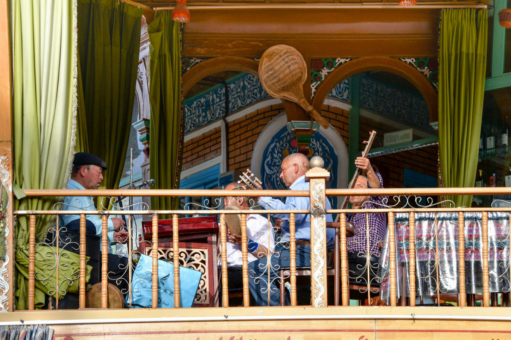 吾斯塘博依路街口的老茶馆也是游客热衷造访的地方之一,这座两层楼的茶馆承载着太多的故事,现在依旧是当地人日常生活不可或缺的场所,很多维族老爷爷会每天来这里喝茶,经常有弹布尔和手鼓艺术家在阳台上弹奏唱歌跳舞,还会热情地教游人们打手鼓、邀请游人们加入跳舞。