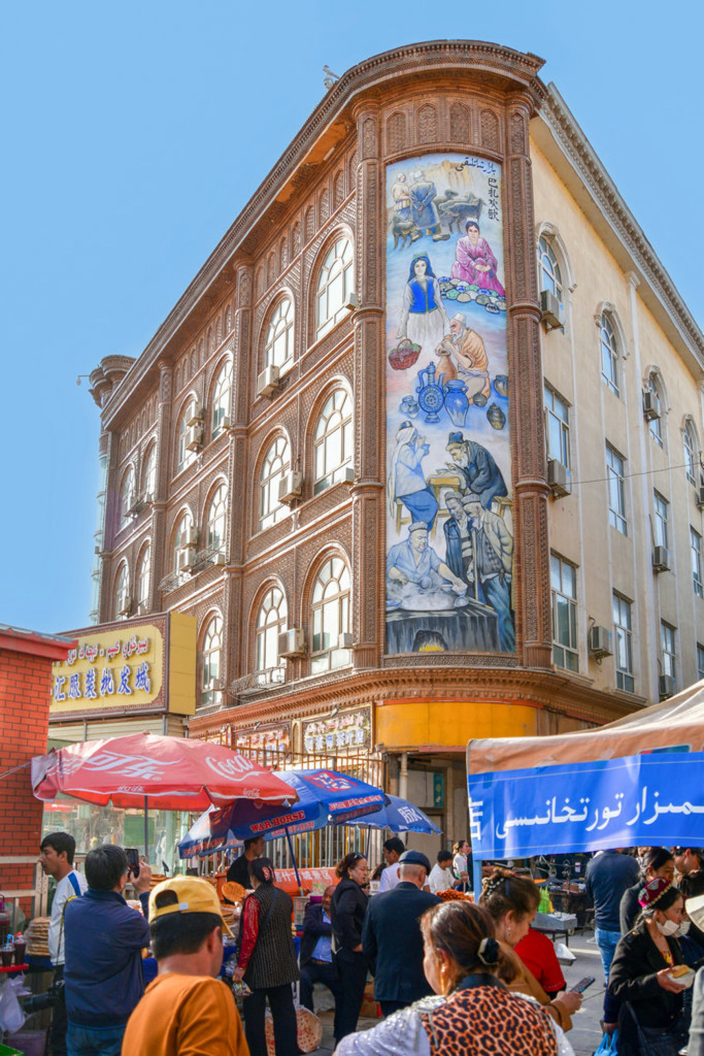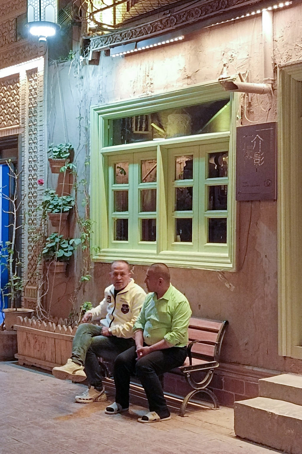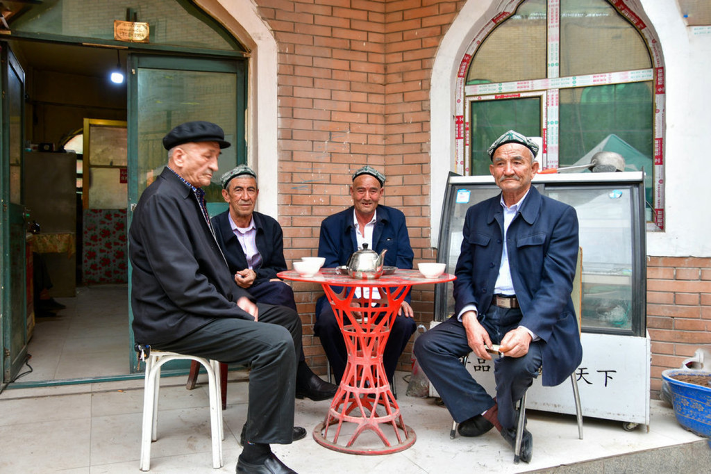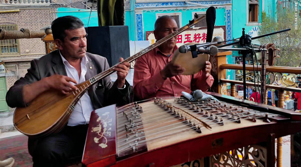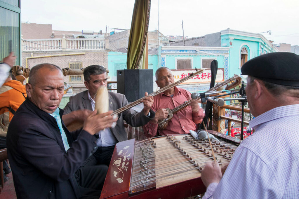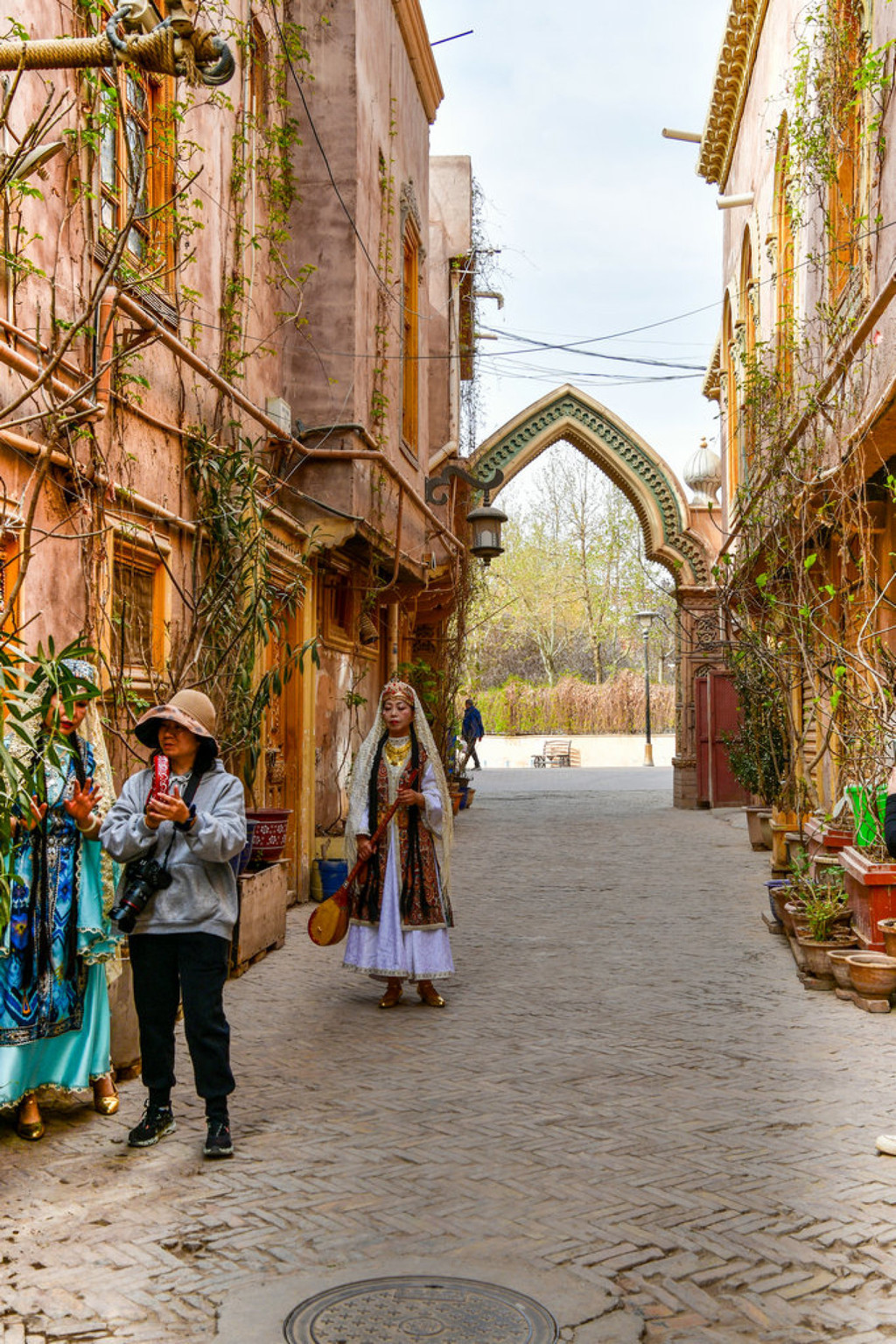 吾斯塘博依路街口的老茶馆也是游客热衷造访的地方之一,这座两层楼的茶馆承载着太多的故事,现在依旧是当地人日常生活不可或缺的场所,很多维族老爷爷会每天来这里喝茶,经常有弹布尔和手鼓艺术家在阳台上弹奏唱歌跳舞,还会热情地教游人们打手鼓、邀请游人们加入跳舞。
