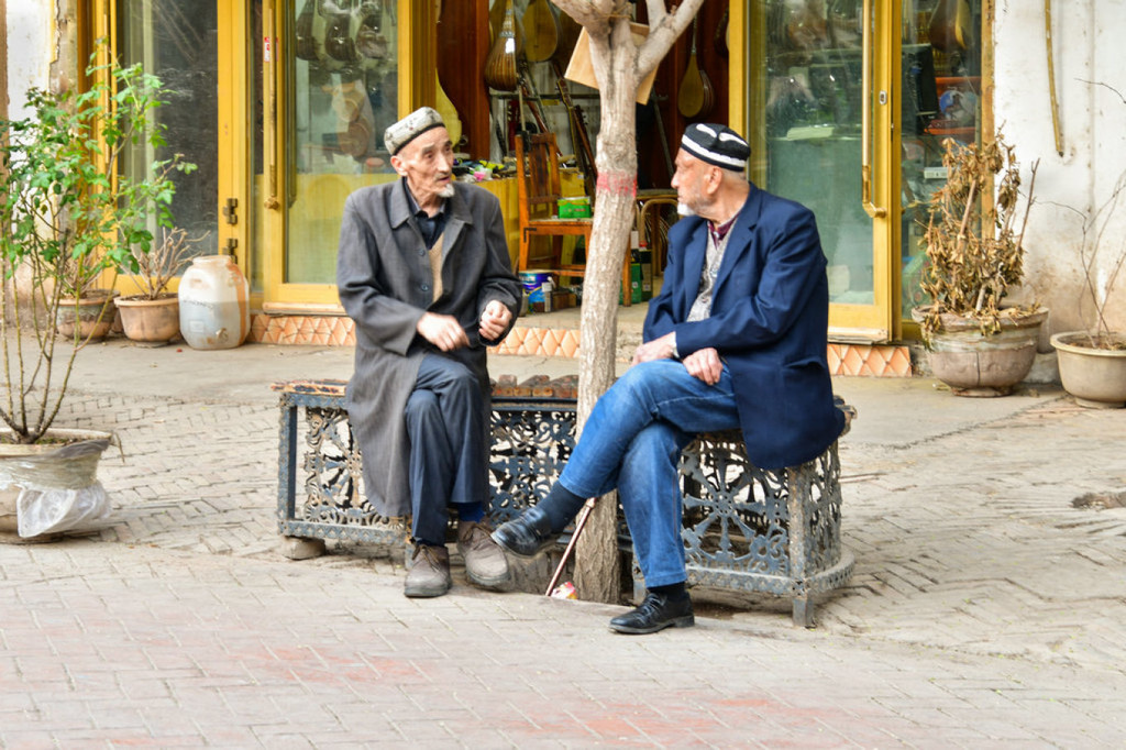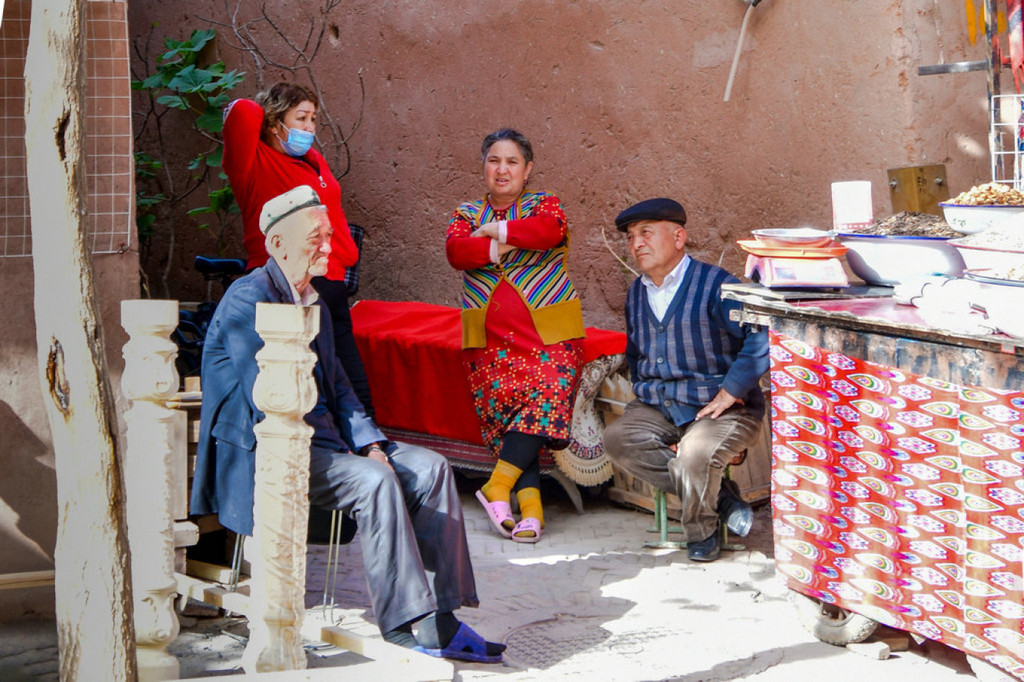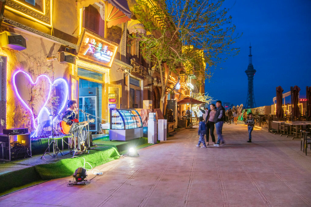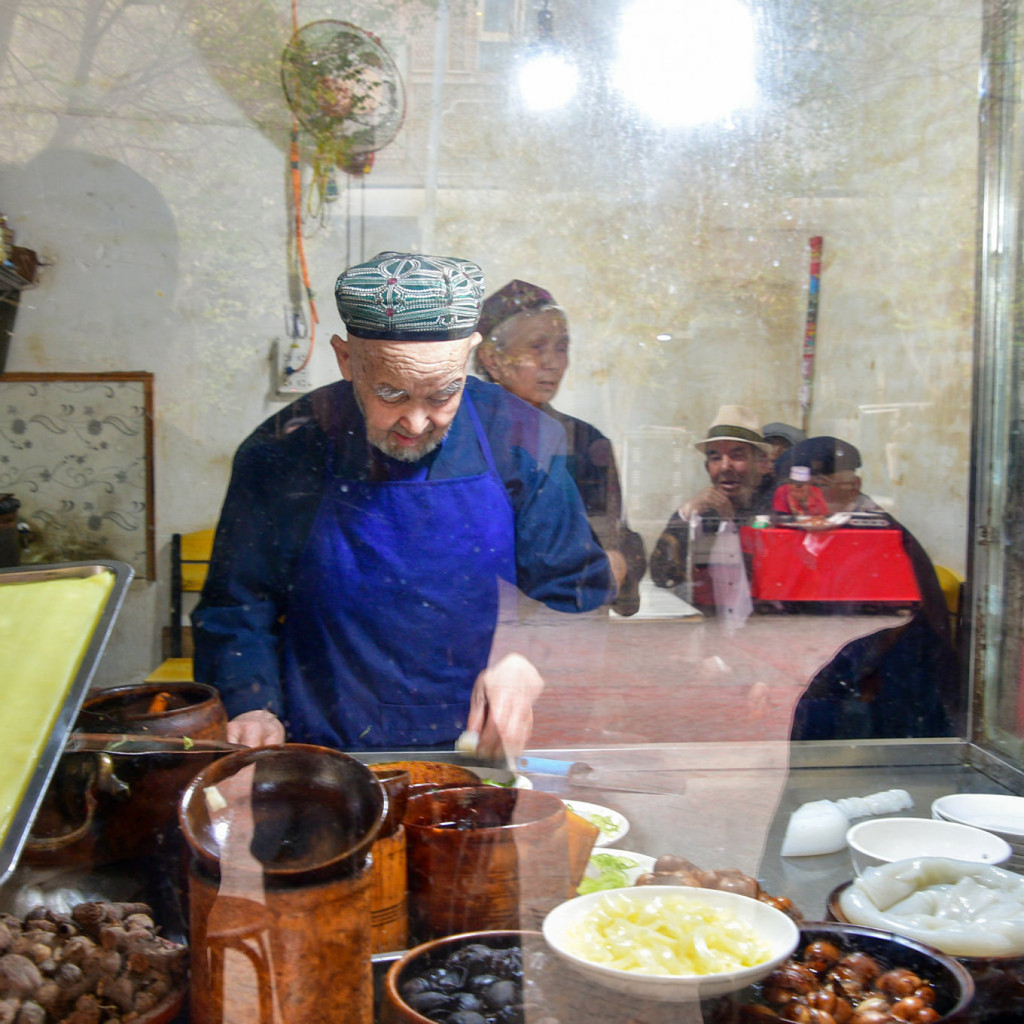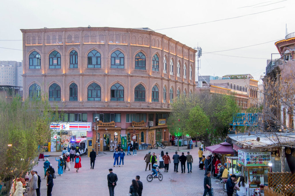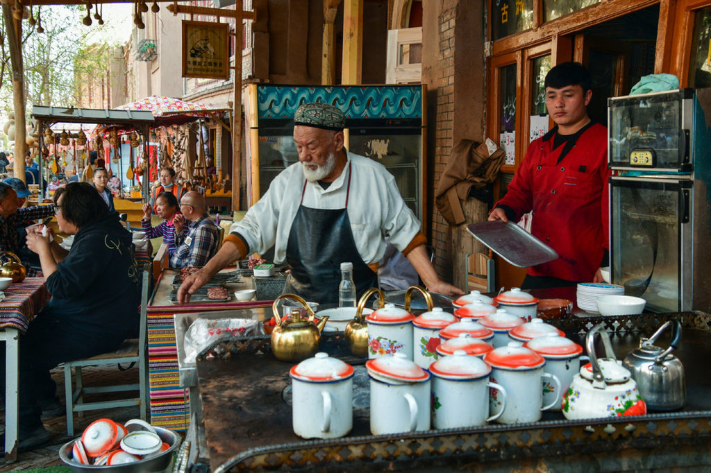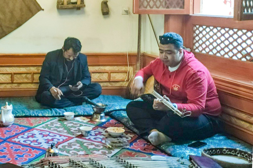 吾斯塘博依路街口的老茶馆也是游客热衷造访的地方之一,这座两层楼的茶馆承载着太多的故事,现在依旧是当地人日常生活不可或缺的场所,很多维族老爷爷会每天来这里喝茶,经常有弹布尔和手鼓艺术家在阳台上弹奏唱歌跳舞,还会热情地教游人们打手鼓、邀请游人们加入跳舞。