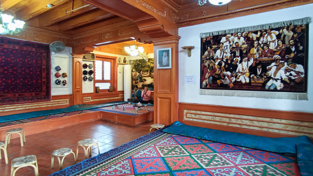 二楼大厅有沿墙半米高的维族土炕,榻面上铺满了精美绚丽的地毯,墙上挂着漂亮的热瓦甫。