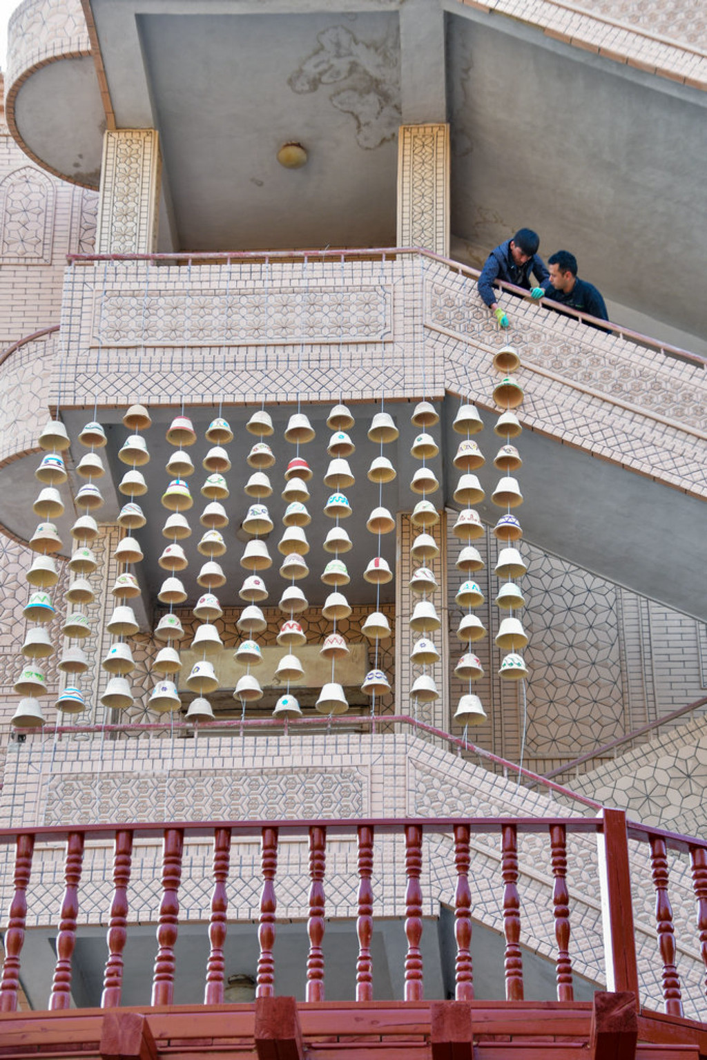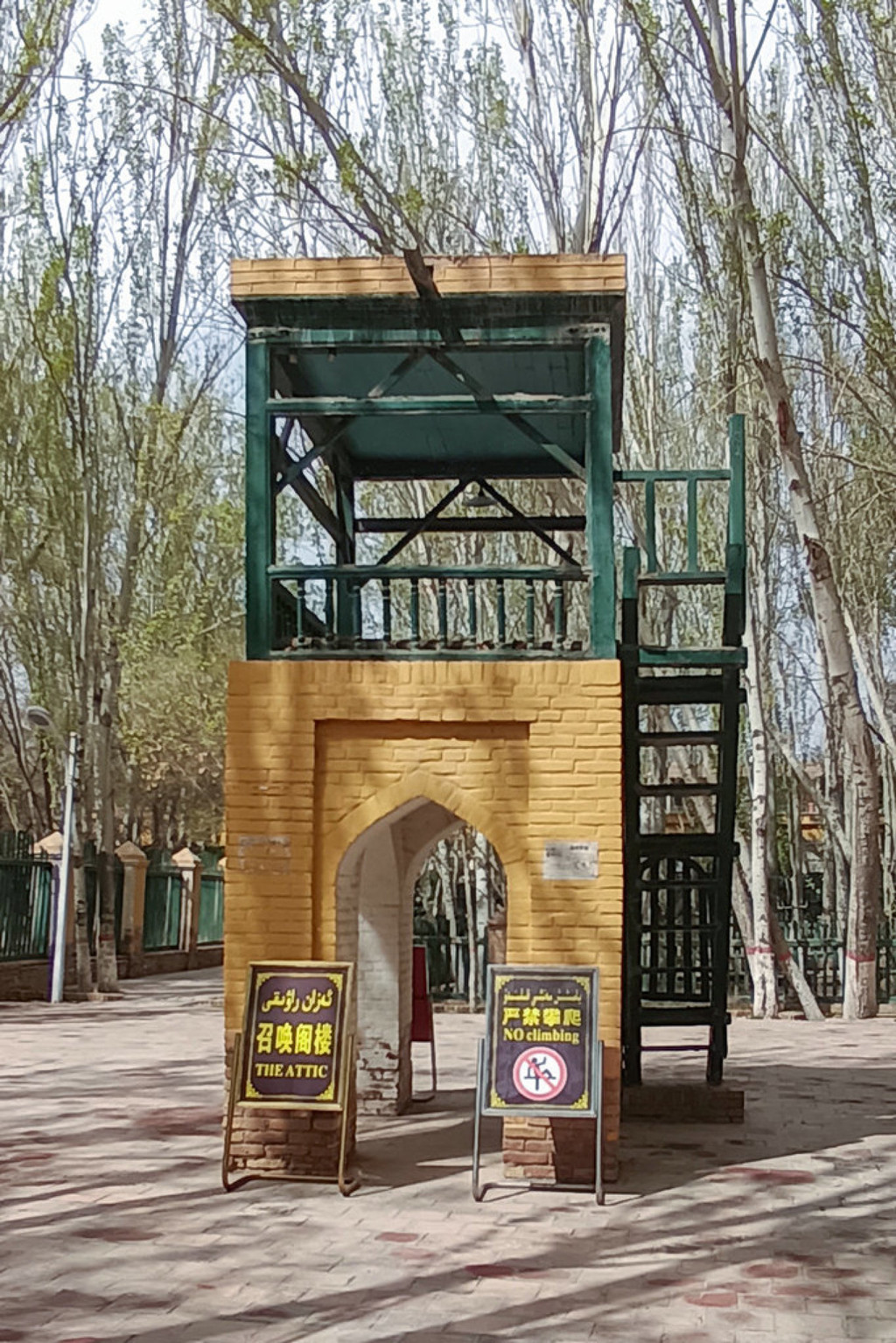 寺门上方的墙顶是一条长8米、距地面10.5米的巨大平台。每逢盛大节日,平台上就会传来通宵达旦响彻云霄的羊皮鼓和锁呐乐声,为云集于艾提杂广场的数万穆斯林制造节日的欢乐气氛,大规模的 ‘撒满”群舞盛况空前,为全疆各地所罕有。