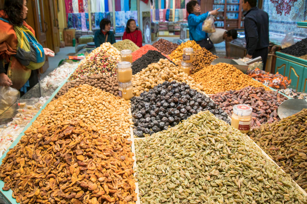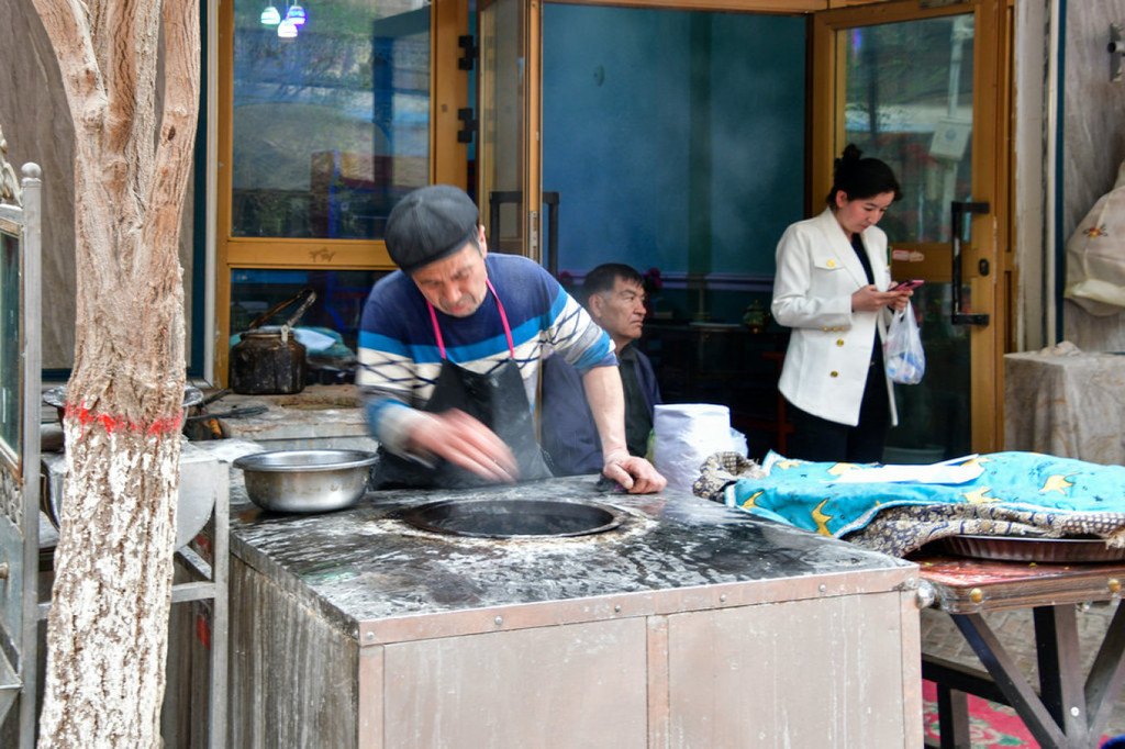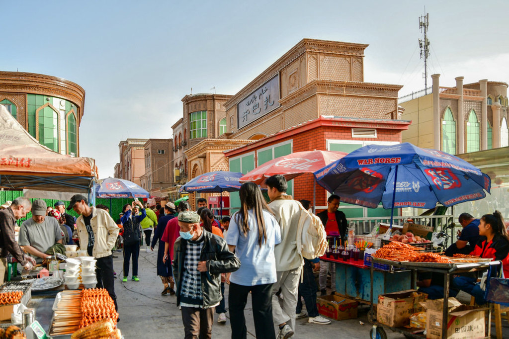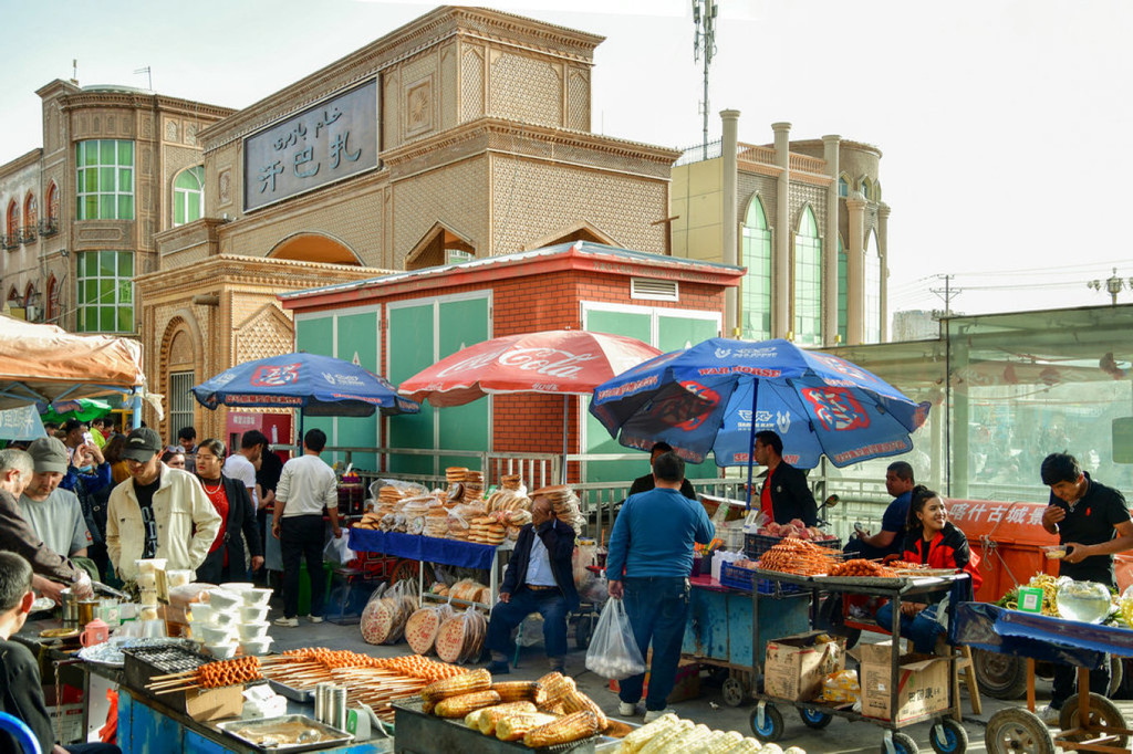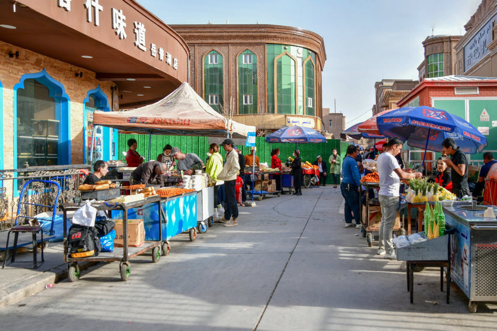 几百米长的汗巴扎老街两旁,几百个摊位依次排开,当地人作为日常主食松软香脆的烤馕,外焦里嫩的烤全羊,滋滋冒油的烤羊肉烤羊肝等,除了烧烤系列,还有卤牛头肉牛蹄筋米肠子等,琳琅满目的美食诱惑着人们的味蕾。