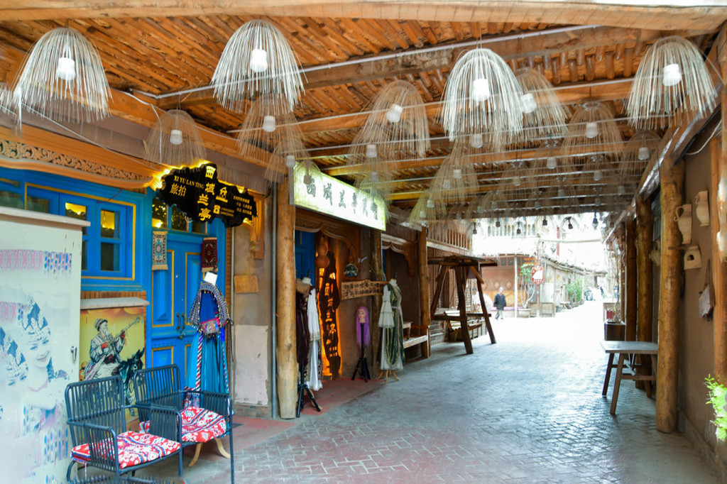 街角巷内,露天搭建的有休息休闲区域,色彩搭配、布置点缀都很有民族特色,很适合拍照
