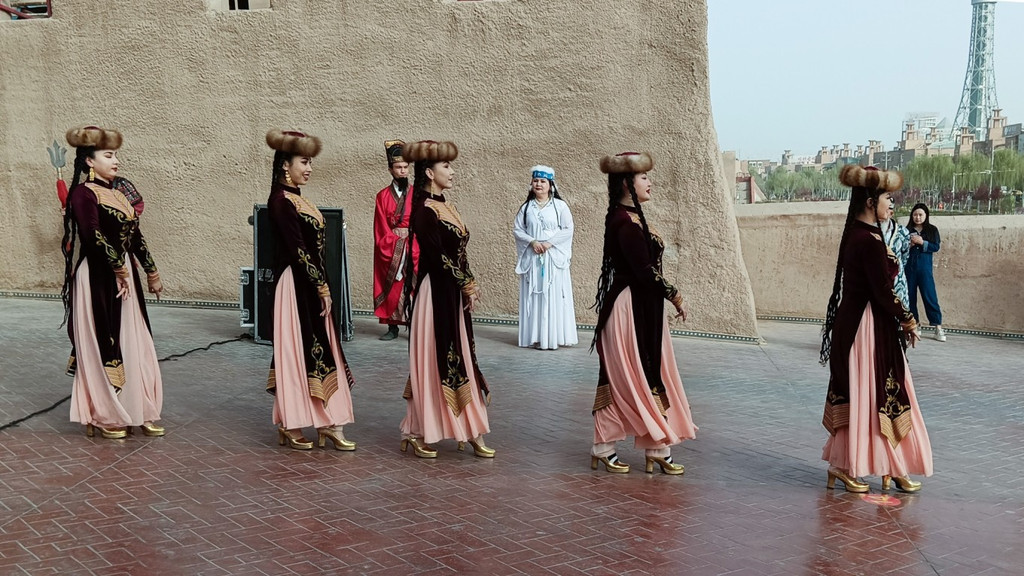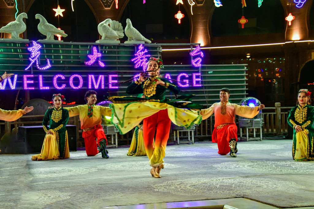 迎宾舞蹈开始,喀什舞蹈,在鼓乐的伴奏下,大家可以学习着维吾尔族,跳起麦西来普的舞蹈。