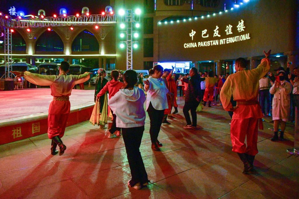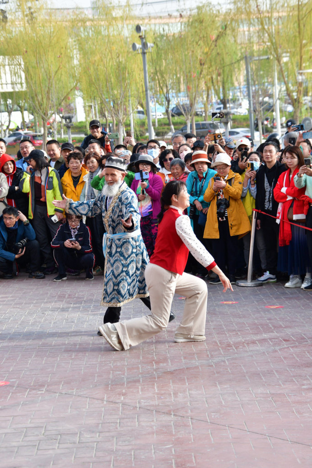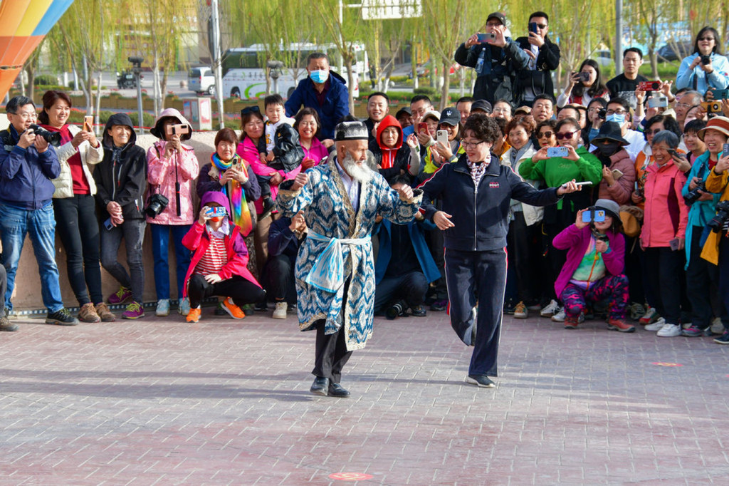 网红老爷爷发上一圈“古丽的家”的名片,开始为开城仪式暖场,翩翩起舞。