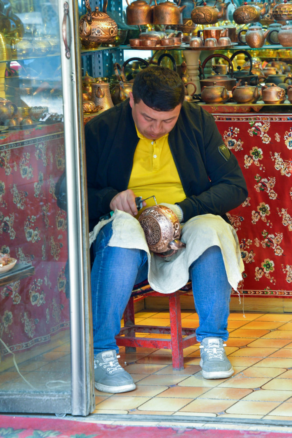 职人街全称为:吾斯塘博依手工艺品一条街,它紧挨着艾提尕尔清真寺,长约一千米,聚集了几百家手工作坊和摊点,俨然成了喀什乃至中亚手工业的精品展览区。