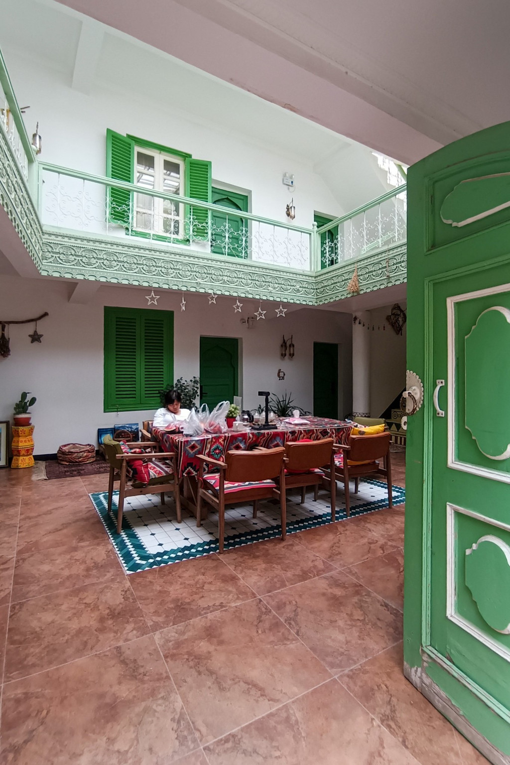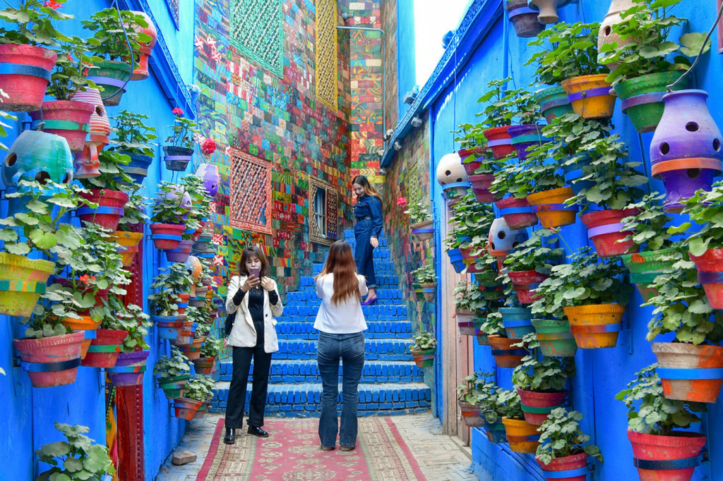 蓝色的墙,雕刻着精美花纹的木质门窗,本身也是一道风景。