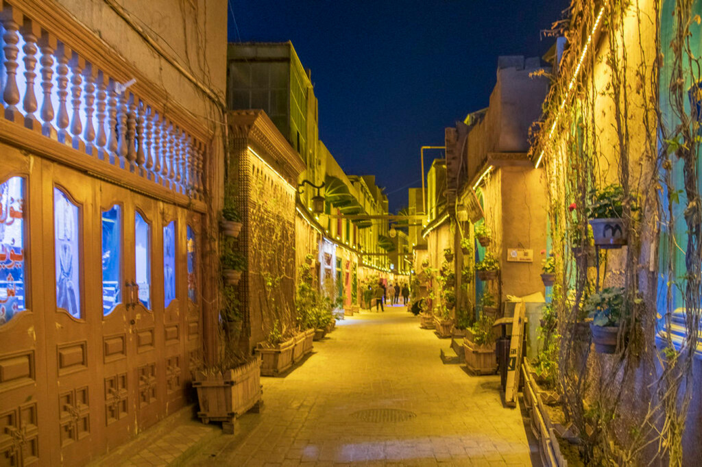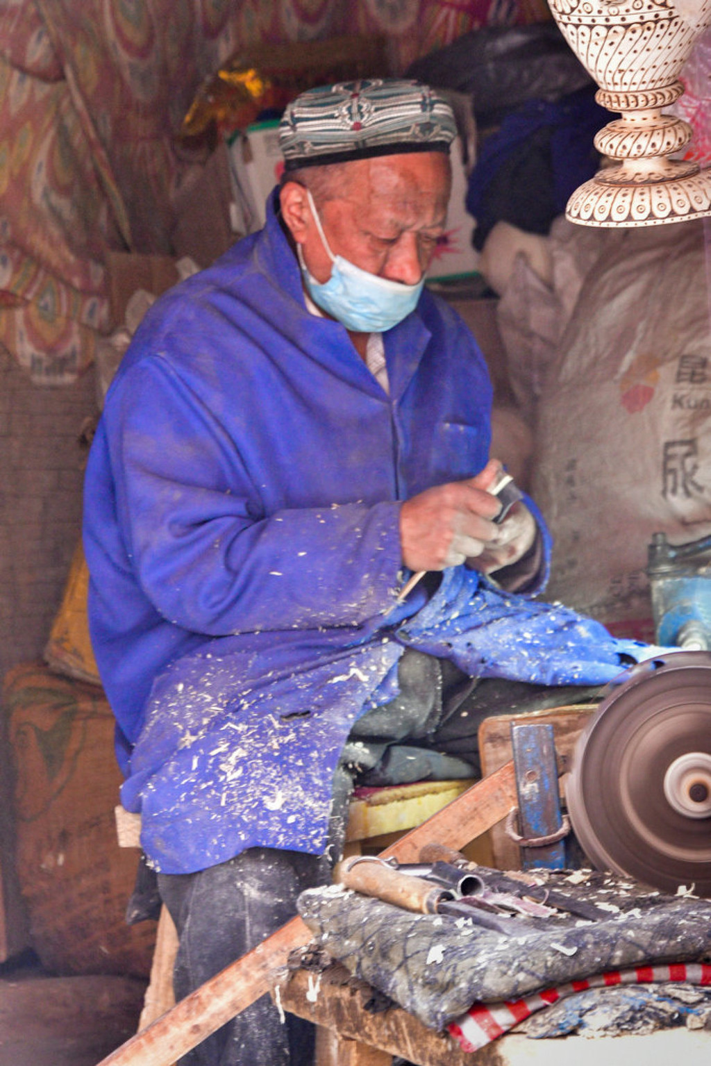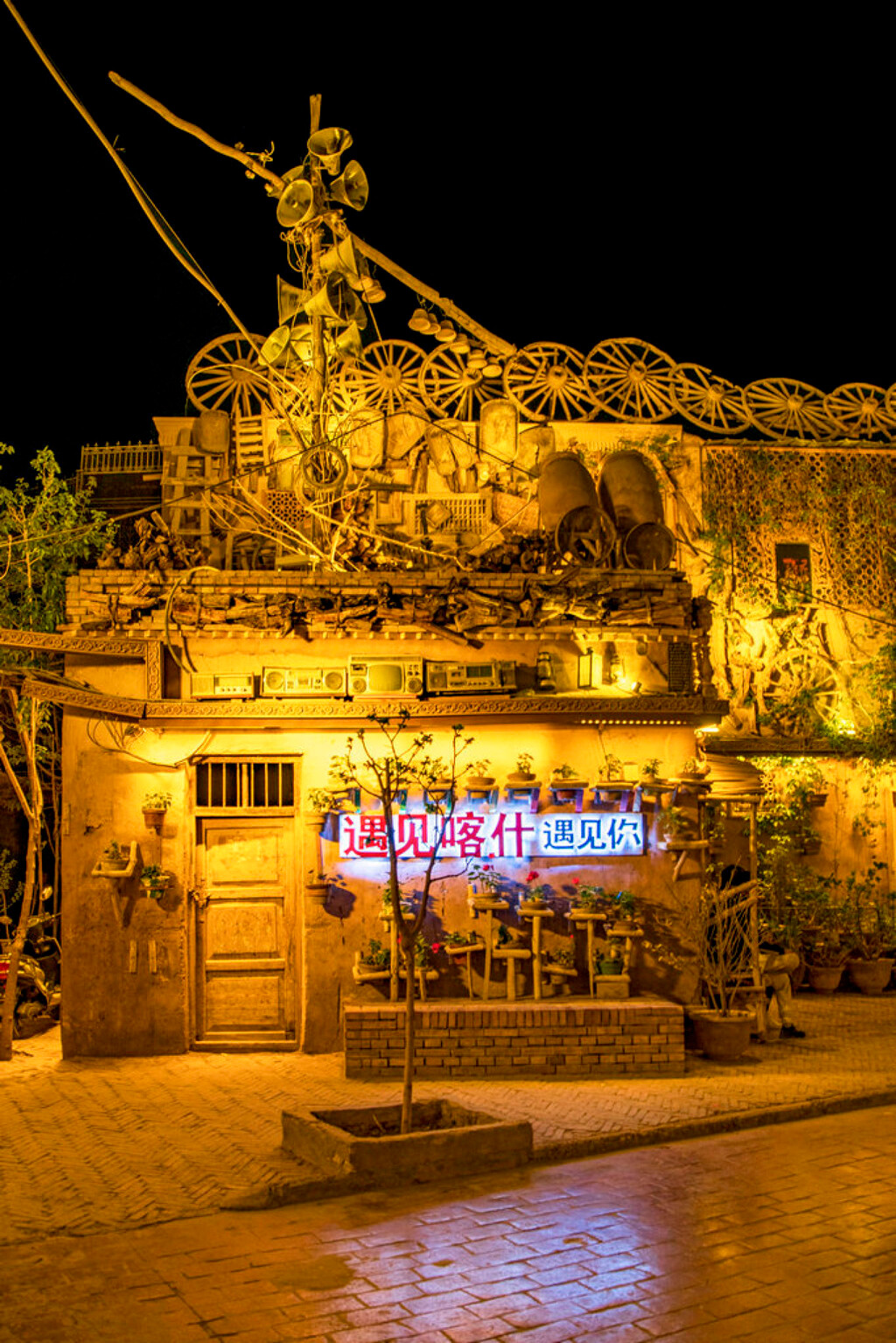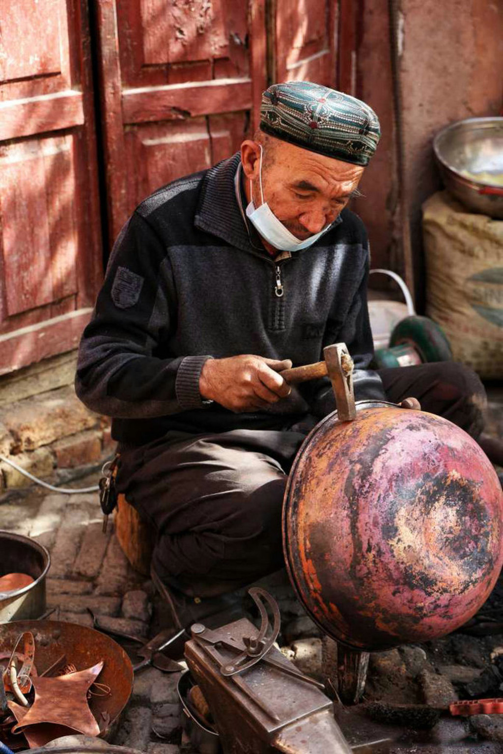 白天在喀什古城里逛逛,能看到喀什的手工艺匠人们在自己的小店里制作各种手工艺品;各式纯手工作坊随处可见,许多工匠至今依旧沿袭着百年传承的手艺,克勤克俭,心无旁骛地坚守着那份世袭的营生。