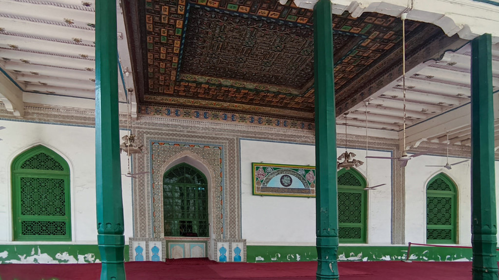 走进大院内便是礼拜堂,在寺院西部的一个高台上,分内殿和外殿;寺顶由158根浅蓝色的立柱托着,呈方格状。顶棚上和木柱的四角,都是精美的木雕和彩绘的藻井图案。