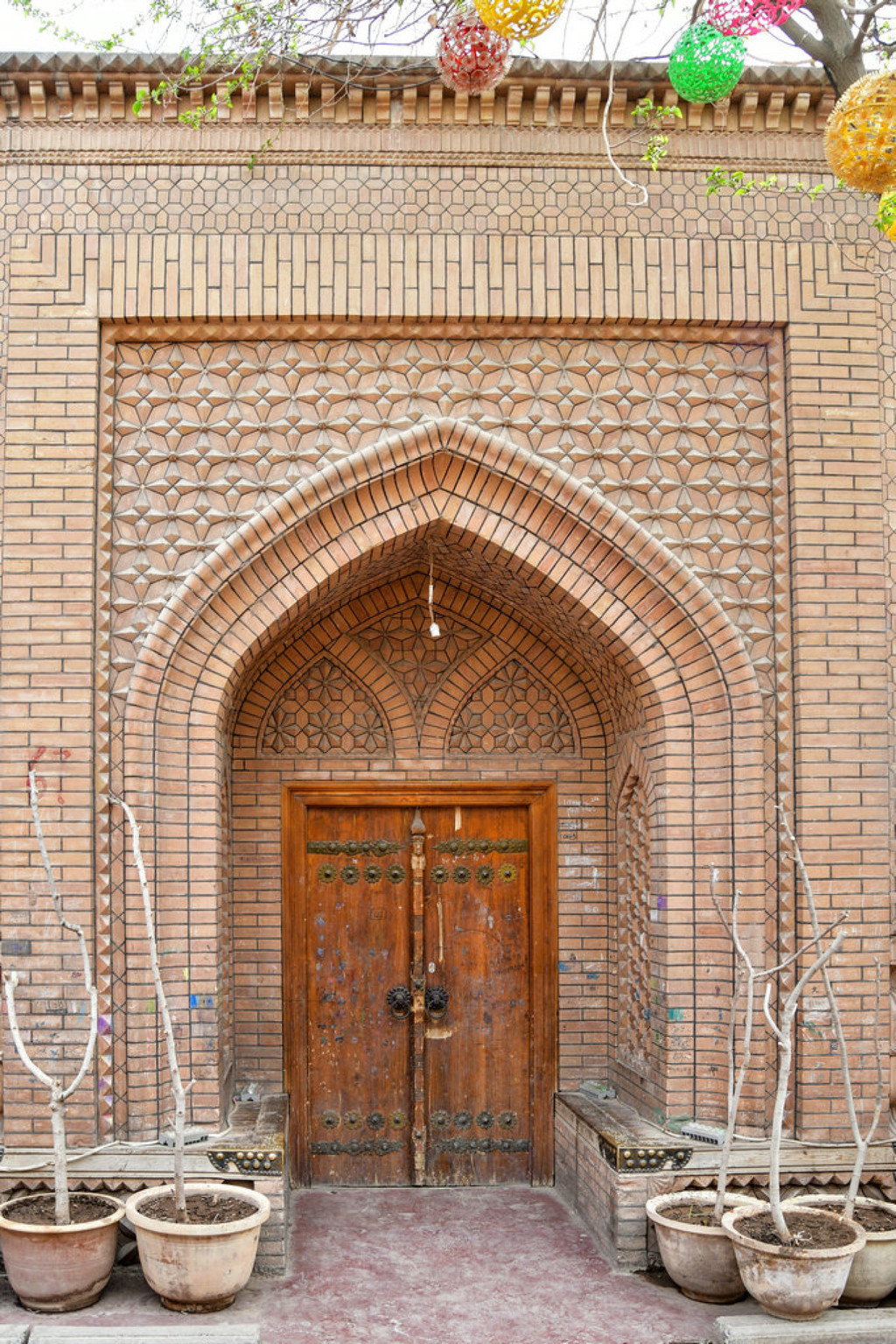 清真寺大门用黄砖砌筑,白石膏勾缝,看上去线条清晰,非常醒目。正门高12.6米,两侧的塔高近18米,大门高4.7米,宽4.3米。门前有一个扇形13级台阶,走上台阶便是门厅,铜包的两扇木门,高大雄伟。