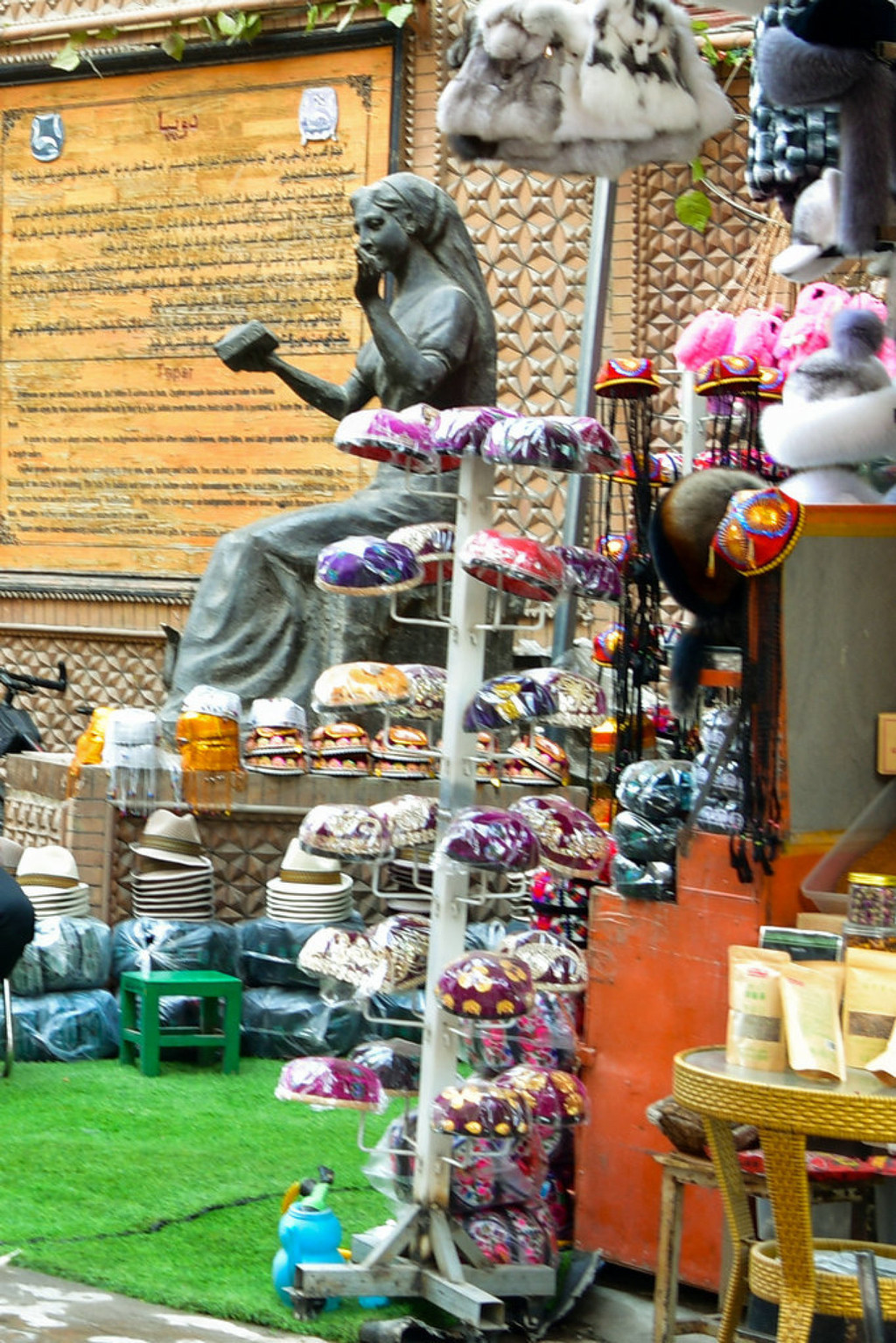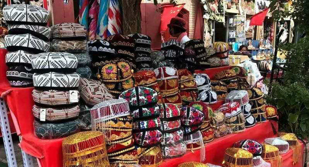 朵帕--花帽:花帽巴扎花帽在维吾尔语里叫“朵帕”,是维吾尔族民间工艺品,也是人们喜爱佩戴的一种装饰品。花帽巴扎中,每个店铺都挂着各式各样的花帽,五颜六色非常漂亮。