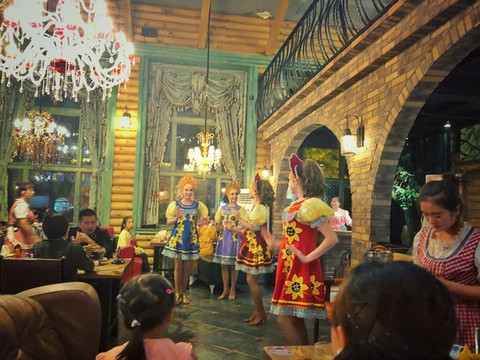 吃到一半, 俄罗斯 姑娘们又唱又跳,扬起室内的灰尘。