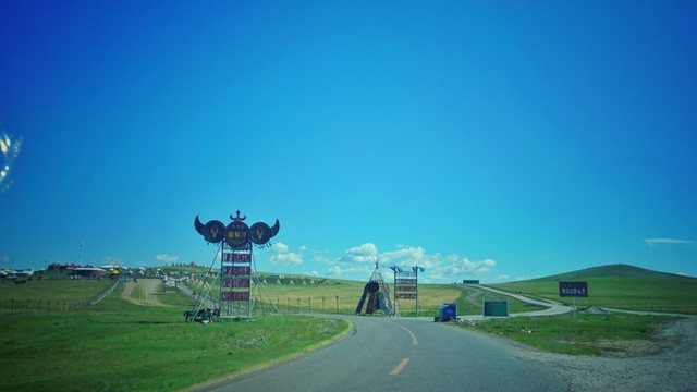 金帐汗草原就是被人为圈起来,进 蒙古 包各种参观的一个并不原生态的景点。沿着我坐在路边 石台 上的这条路,通向的是一个巨大 蒙古 包。