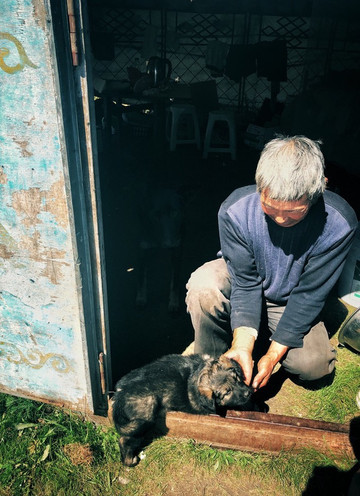 于是跟着小王司机去看小狗。小王来到 蒙古 包前。老牧民很热情,让我们进去坐。我没敢进去坐,里边逼仄、空气质量不佳,还有无数的蚊蝇在飞。见我们不进去,主人就把小狗取来了。又圆又胖。后边帐篷内的黑暗里是小狗的妈妈,仔细看能看到它满面愁容,眼里只有这只小狗。小王把小狗装到了纸箱里放了后备箱。如果是我的话,可能在临走前会把小狗抱到它妈妈鼻子前,让它们告个此生不再见的别。