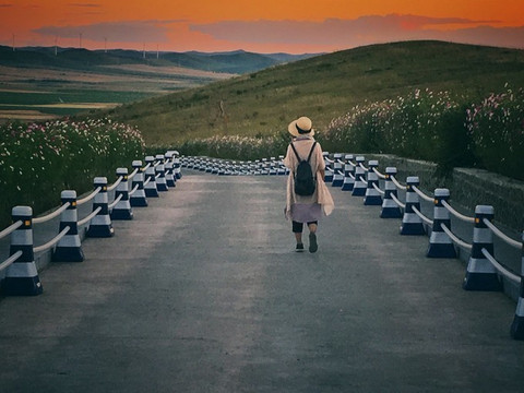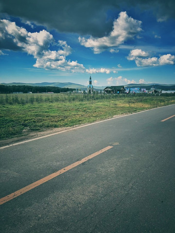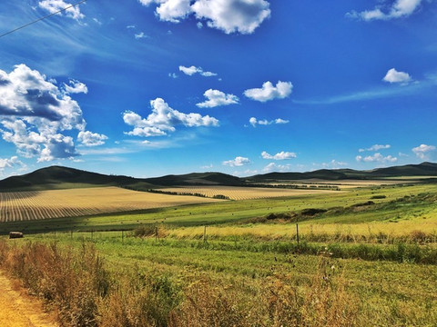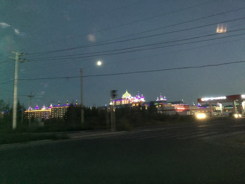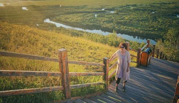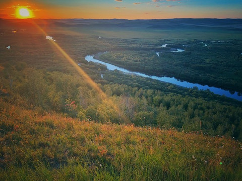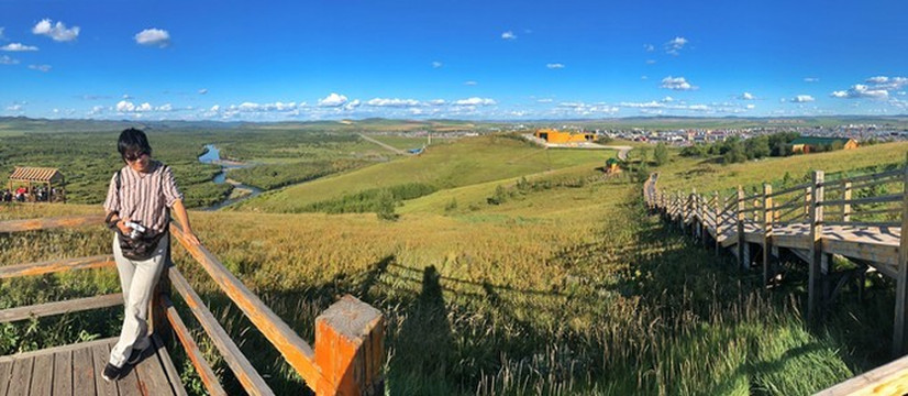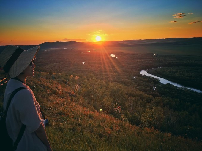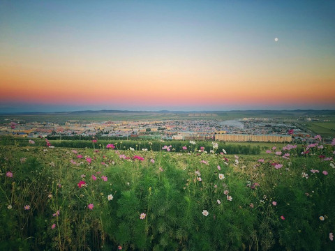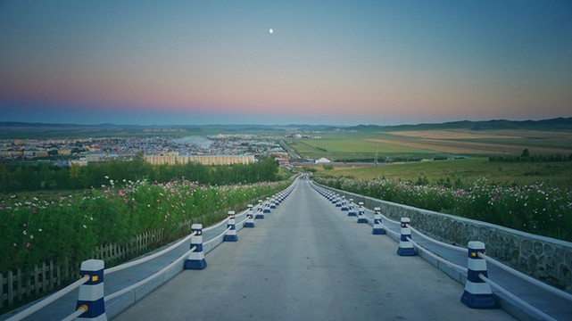 当时我们脑子有点糊涂,害怕日落完结天空一瞬间变黑就没等太阳全落完就离开了山顶平台。也好,这样,就像是永不结束的一天。接驳车已经停运,我们步行走下山。道路空荡,显得很大气。有一种专属我们的感觉。山下就是 额尔古纳 城,还有更广阔的农田。这真是避世的优选之地。