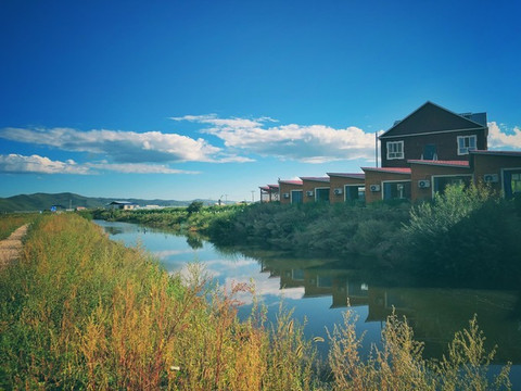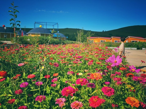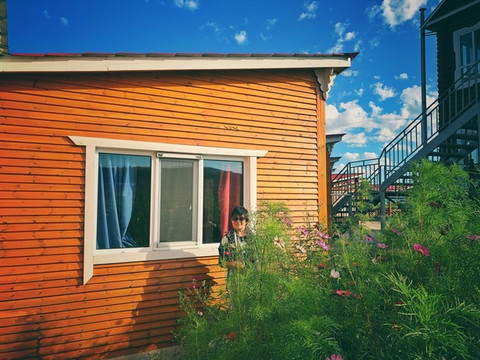 走远一点回头看,我们住的那一排木刻楞原来身处这样的环境中。门前花海,窗外池塘,房子、花和水这么紧密地簇拥在一起,但放眼望,远处是牧场大片的平缓。