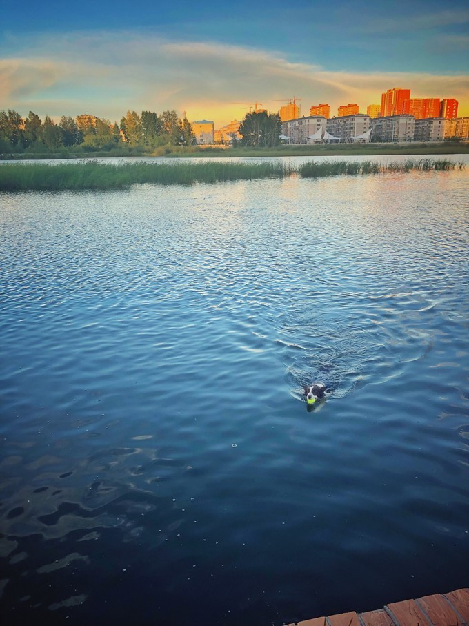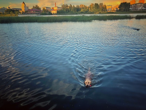 河中有两只积极而清高的狗,一只金毛一只边牧。说积极是因为,主人扔出去的网球、瓶子它们不辞辛劳一次次巡回。主人很是气人,扔到 水里 的东西刚递到手上瞬间就又给抛出去了。但狗非常高兴,它们天性喜欢寻回。说它们清高是因为当它们两登岸的时候,我过去示好,它们两都没理我,马上投入百忙之中。