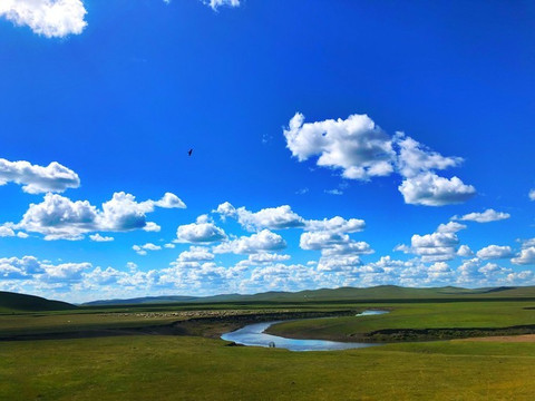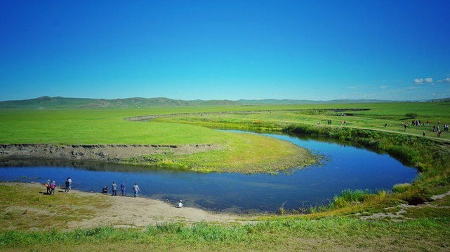还有一条简陋的河,河边一堆人在看它。也不知道看什么。我发现,当天地之间只有一样东西与别处不同的时候,无论那个东西多么平淡,也会吸引人们的注意力。的确是,蓝天之下的旷阔草原就这一条河现在蜿蜒在这里,不看它看什么呢。