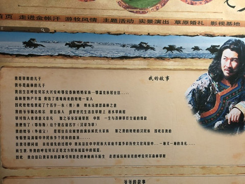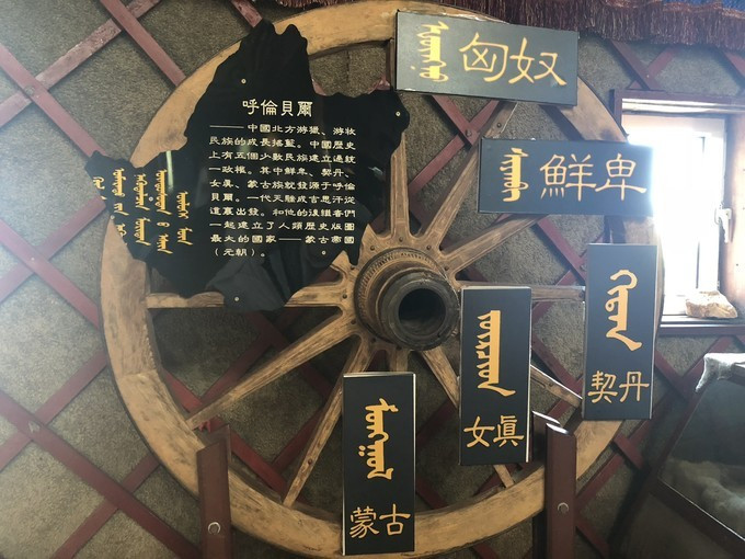 大 蒙古 包里有很多知识点。但是装潢这些知识点真的很凑合。这个是介绍 呼伦贝尔 都出过哪些民族,几个牌子就挂在一车轮上。不知道是不是表达着历史的车轮不断前进的意思。