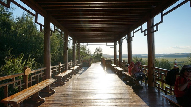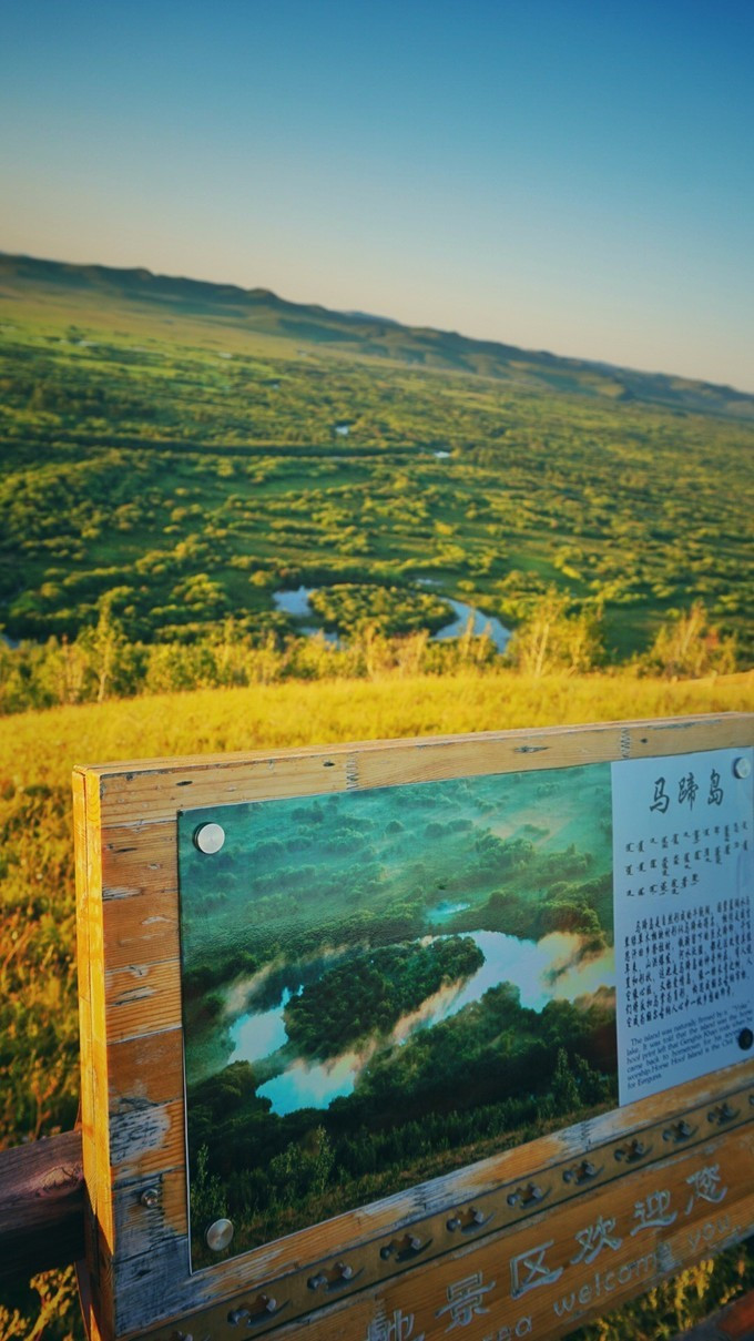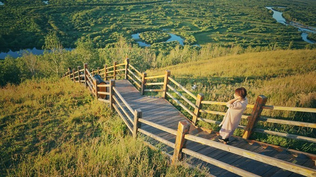 沿着栈道走几步就到达了山顶的一个观望亭,辽远的湿地展现在眼前。不过,这片 亚洲 第一湿地样貌并没有 漠河 的九曲十八弯好看。这两个地方,高度重合。如果二选一的话,建议选择 漠河 的九曲十八弯。